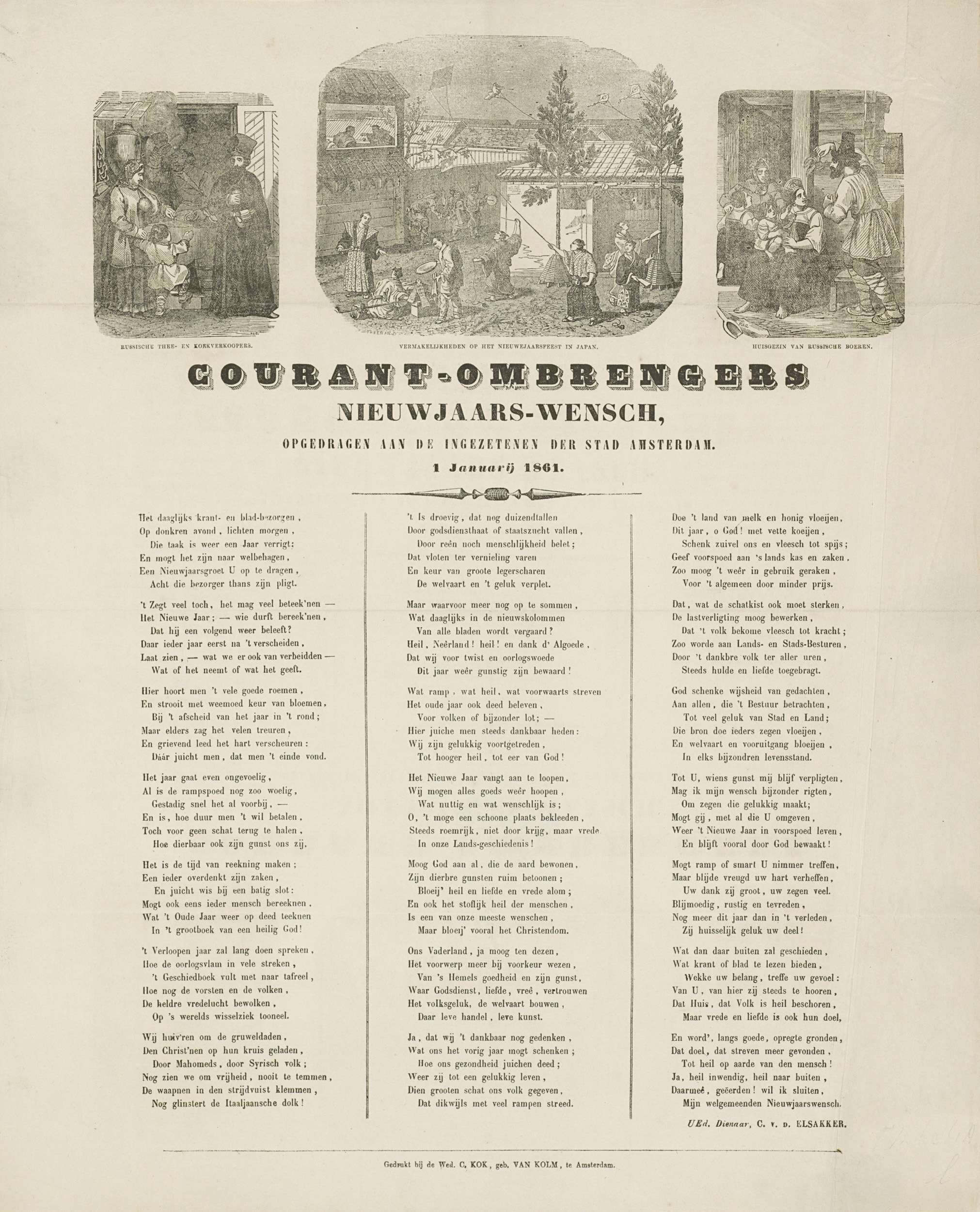 Nieuwjaarswens namens de ombrengers van couranten (krantenbezorgers) te Amsterdam voor het jaar 1861. Bovenaan drie vignetten aan boeken ontleend, met centraal een nieuwjaarsfeest in Japan, links Russische thee- en koffieverkopers, rechts een Russische boerenfamilie. Onderaan een gedicht in drie kolommen. Van de courantombrenger: C. v.d. Elsakker.