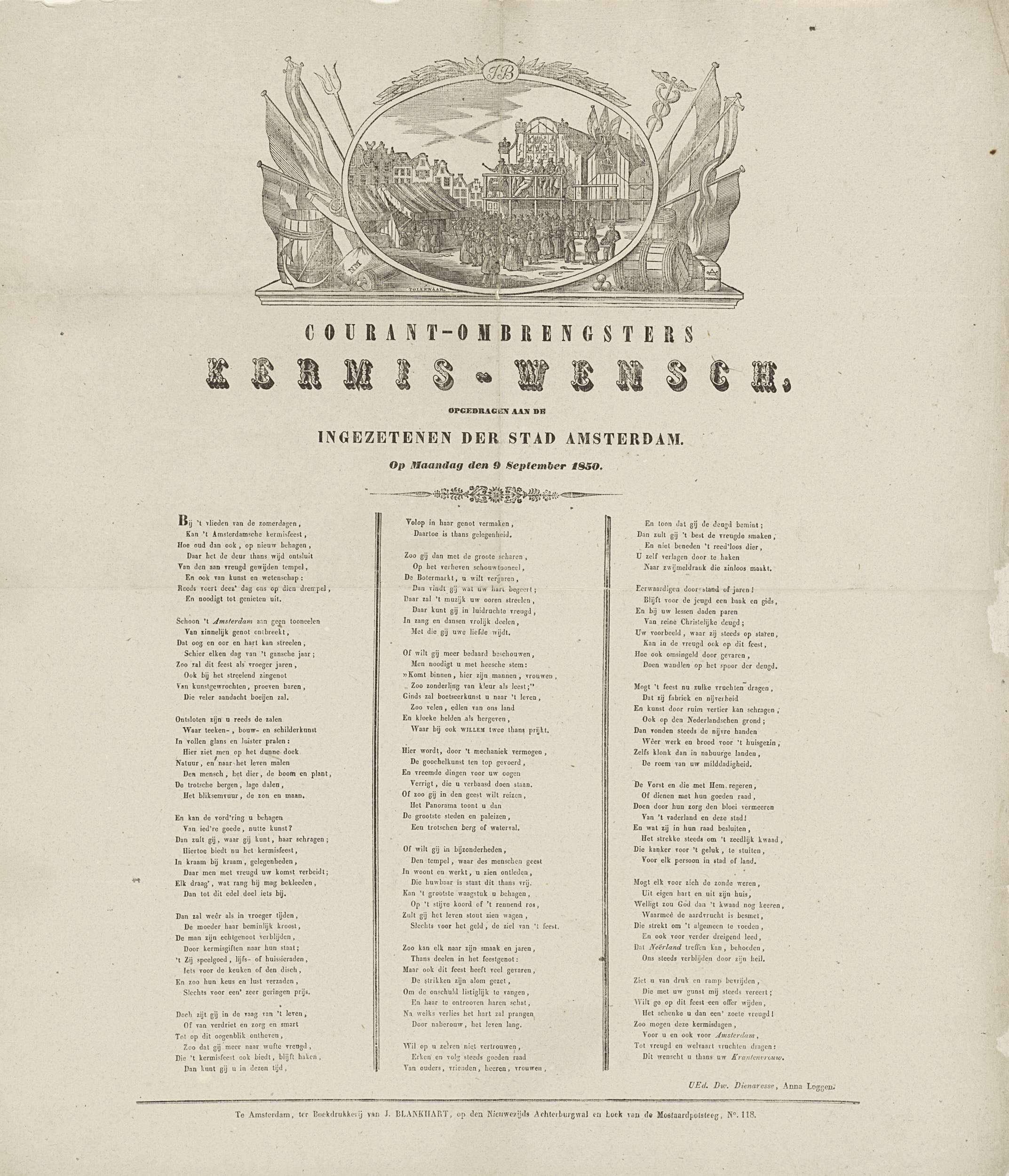 Kermisprent namens de ombrengsters van couranten (krantenbezorgers) te Amsterdam, 9 september 1850. Bovenaan een medaillon met een gezicht op de kermis op de Botermarkt. Onderaan een gedicht in drie kolommen. Van de courantombrengster: Anna Loggen.