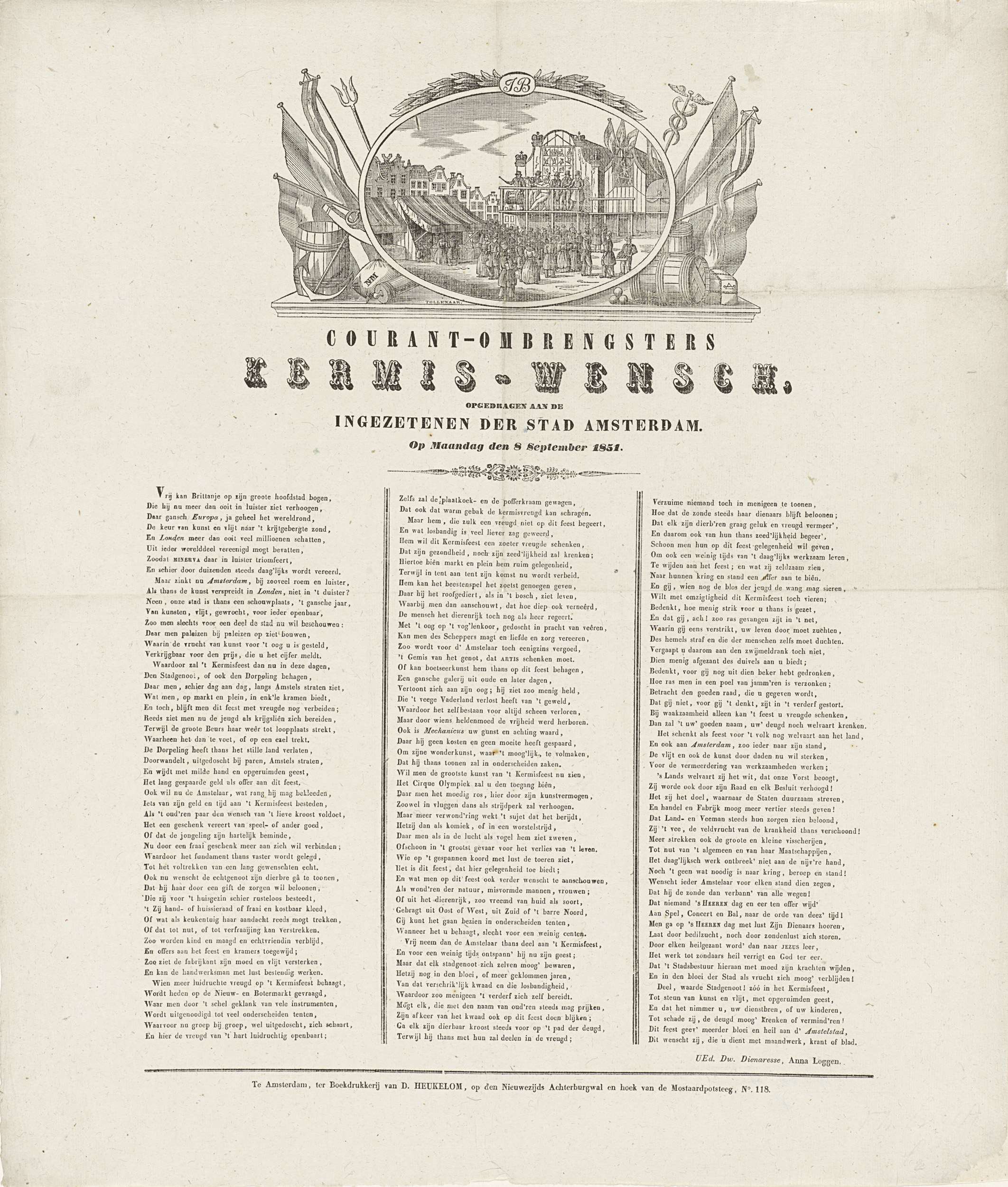Kermisprent namens de ombrengsters van couranten (krantenbezorgers) te Amsterdam, 8 september 1851. Bovenaan een medaillon met een gezicht op de kermis op de Botermarkt. Onderaan een gedicht in drie kolommen. Van de courantombrengster: Anna Loggen.