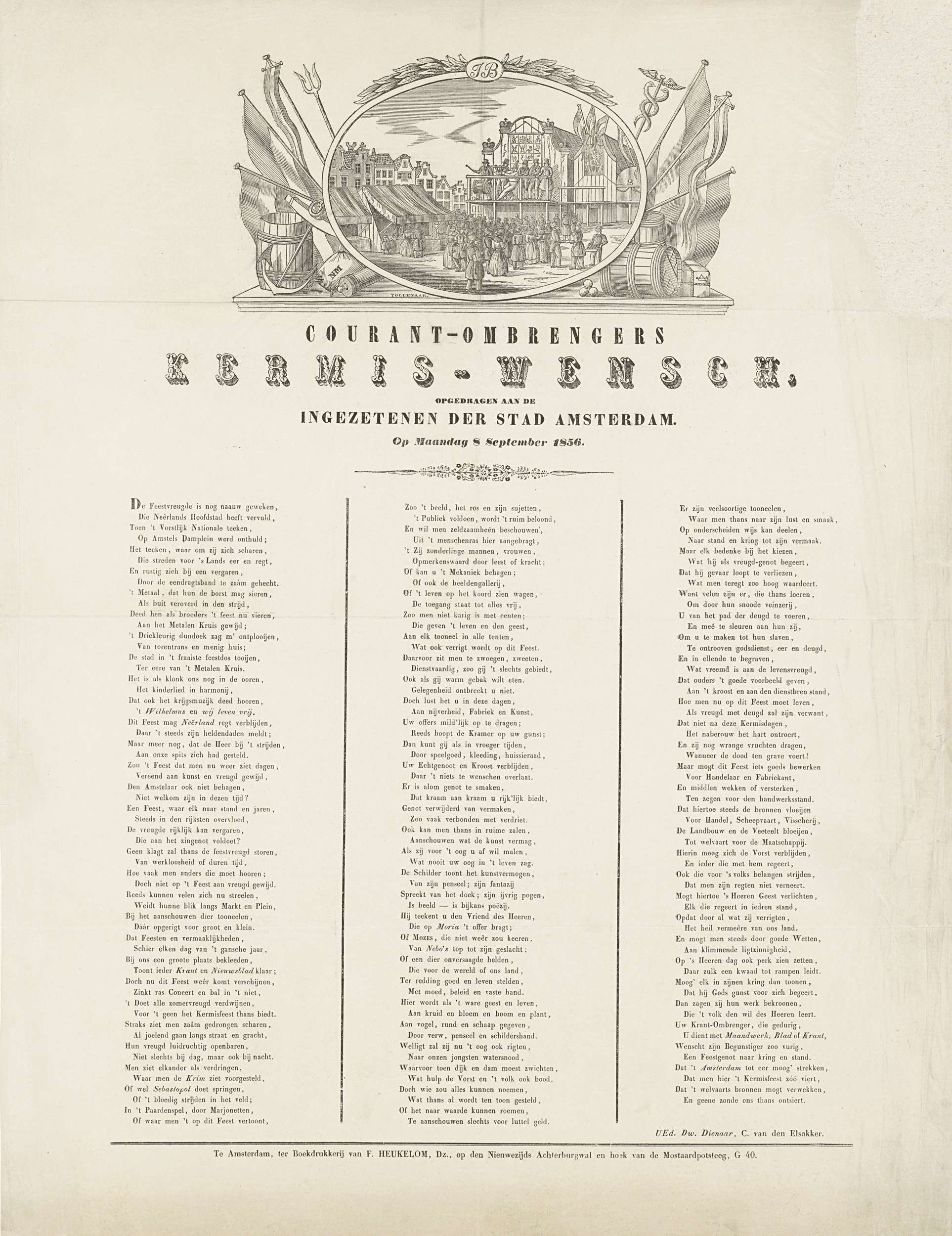 Kermisprent namens de ombrengers van couranten (krantenbezorgers) te Amsterdam, 8 september 1856. Bovenaan een medaillon met een gezicht op de kermis op de Botermarkt. Onderaan een gedicht in drie kolommen. Van de courantombrenger: C. van den Elsakker.