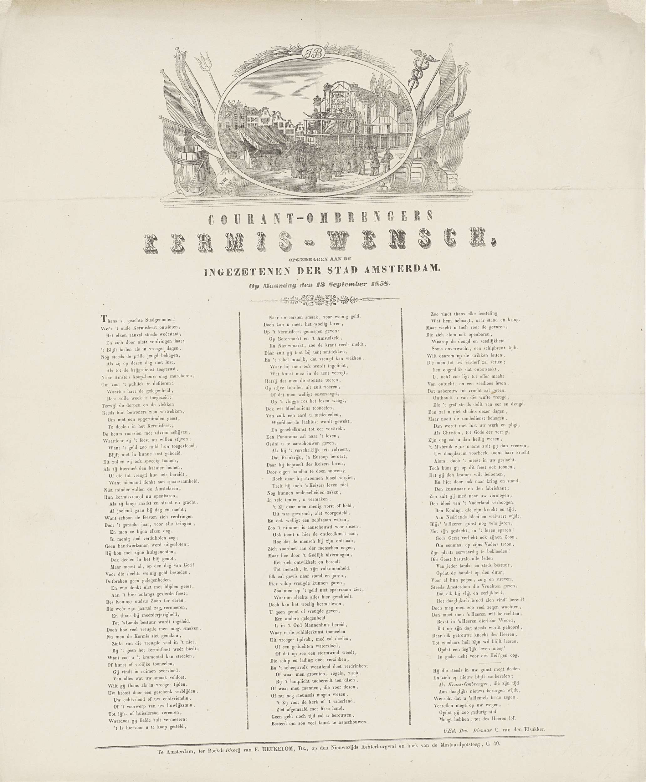 Kermisprent namens de ombrengers van couranten (krantenbezorgers) te Amsterdam, 13 september 1858. Bovenaan een medaillon met een gezicht op de kermis op de Botermarkt. Onderaan een gedicht in drie kolommen. Van de courantombrenger: C. van den Elsakker.