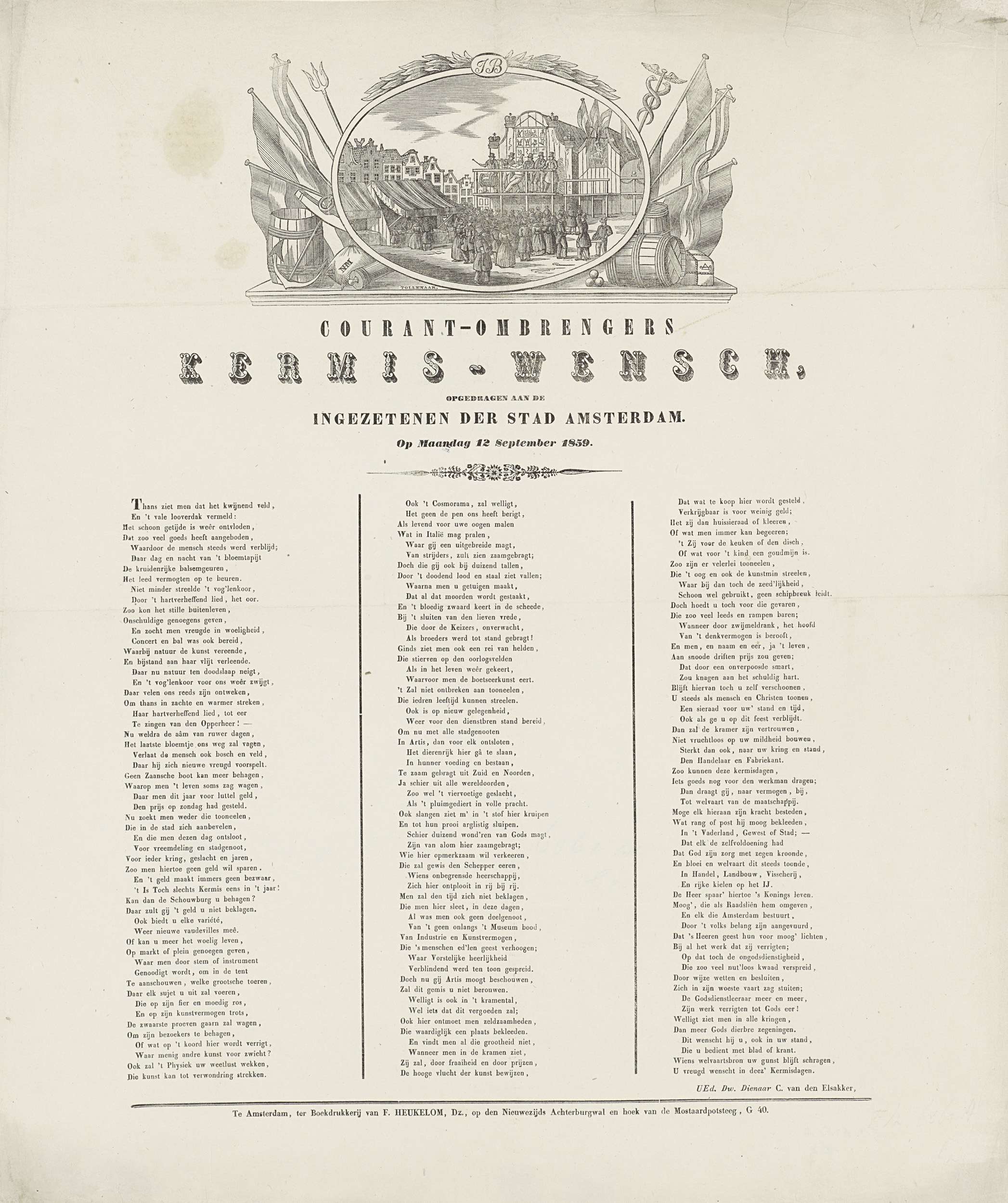 Kermisprent namens de ombrengers van couranten (krantenbezorgers) te Amsterdam, 12 september 1859. Bovenaan een medaillon met een gezicht op de kermis op de Botermarkt. Onderaan een gedicht in drie kolommen. Van de courantombrenger: C. van den Elsakker.