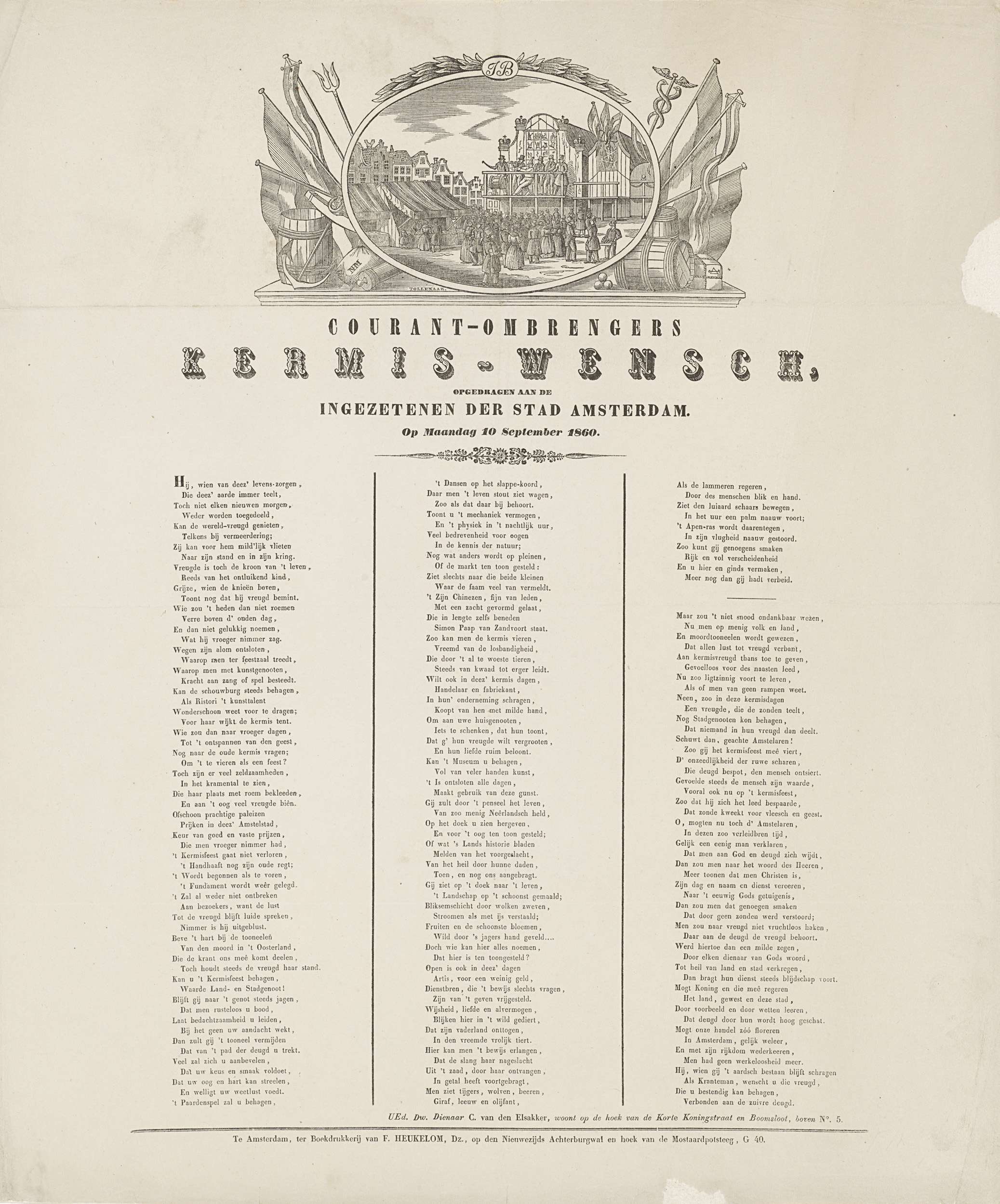 Kermisprent namens de ombrengers van couranten (krantenbezorgers) te Amsterdam, 10 september 1860. Bovenaan een medaillon met een gezicht op de kermis op de Botermarkt. Onderaan een gedicht in drie kolommen. Van de courantombrenger: C. van den Elsakker.