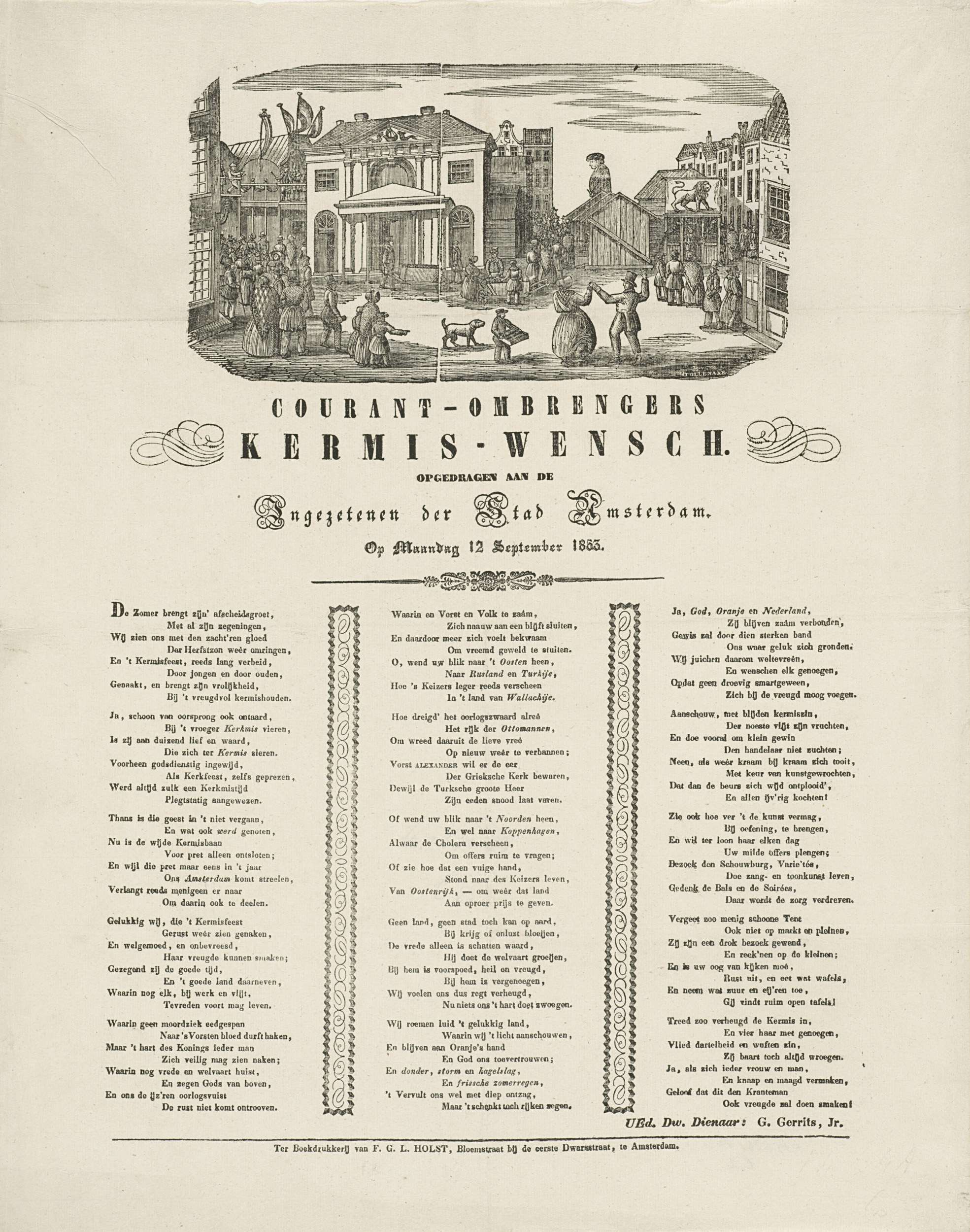 Kermisprent namens de ombrengers van couranten (krantenbezorgers) te Amsterdam, 12 september 1853. Bovenaan de kermis op de Botermarkt met de Boterhal en het standbeeld van Rembrandt (onthuld mei 1852). Onderaan een gedicht in drie kolommen. Van de courantombrenger: G. Gerrits Jr.