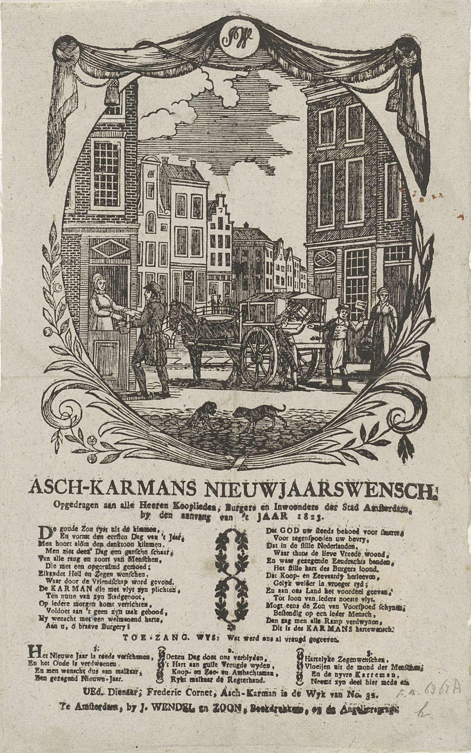 Nieuwjaarswens namens de askarrenmannen (karrenman of vuilnisman) te Amsterdam voor het jaar 1823. Gezicht in een straat te Amsterdam met een jongen die een asemmer in een kar leeg gooit, een jongen met een ratel en een man die aan huis geld ophaalt. Onderaan een gedicht in twee kolommen en een lied in drie verzen. ...