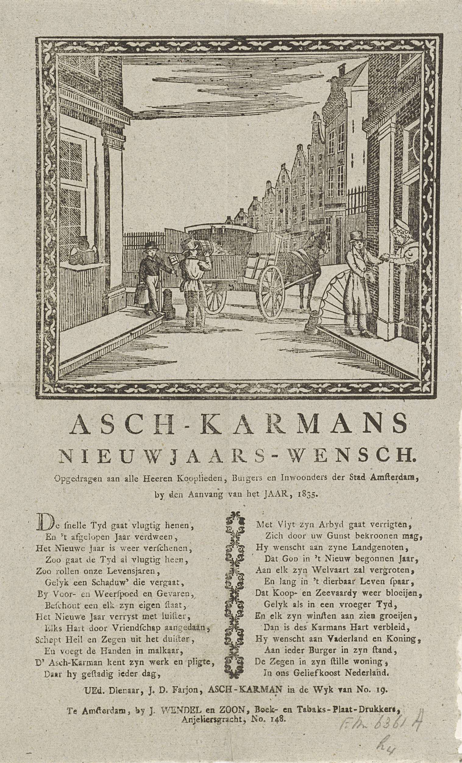 Nieuwjaarswens namens de askarrenmannen (karrenman of vuilnisman) te Amsterdam voor het jaar 1835. Gezicht in een straat te Amsterdam met een man die een asemmer in de kar leegkiepert, een jongen met een ratel en een andere man die aan huis geld ophaalt. Onderaan een gedicht in twee kolommen. Namens J.D. Farjon, de askarreman van ...