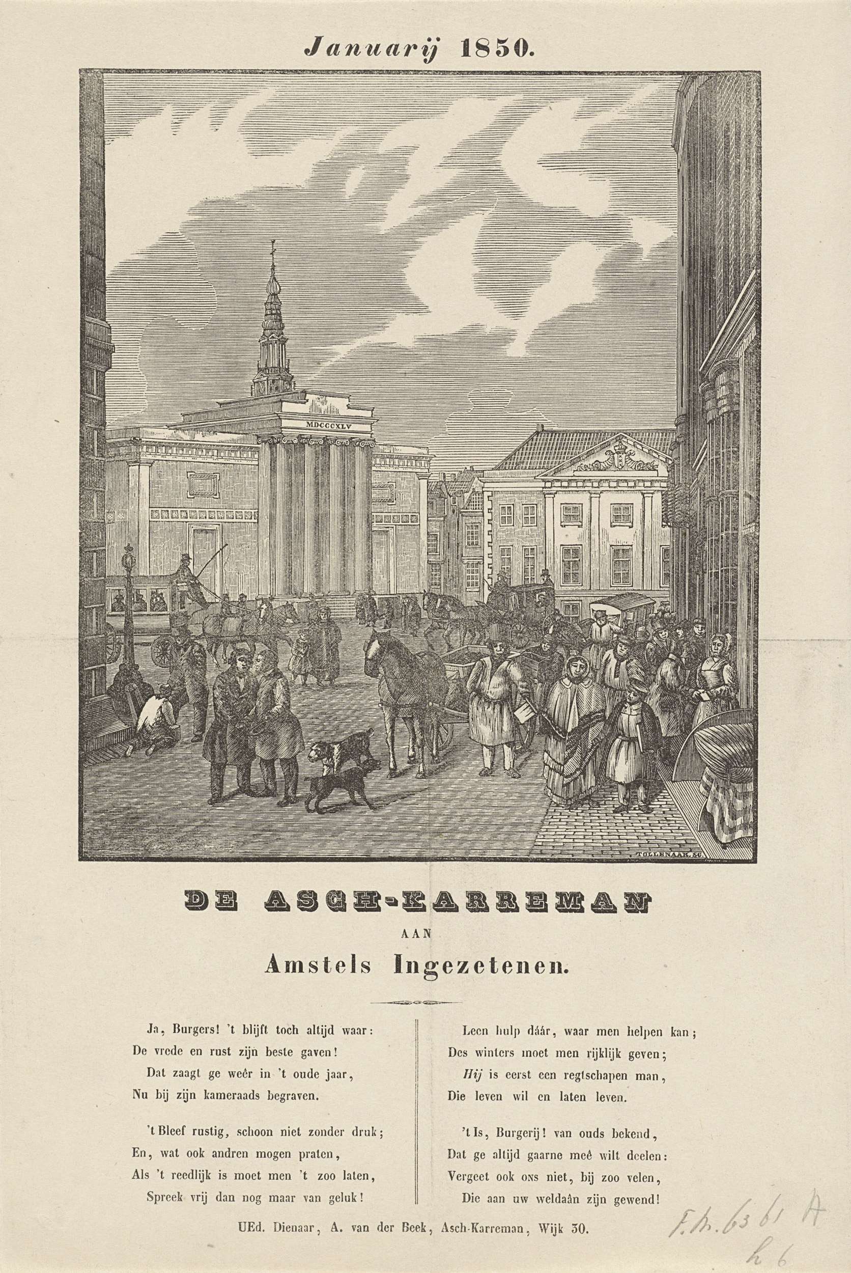 Nieuwjaarswens namens de askarrenmannen (karrenman of vuilnisman) te Amsterdam voor het jaar 1850. Gezicht op de Dam te Amsterdam met de Beurs van Zocher en het Commandantshuis. Tussen het publiek de vuilnismannen met hun kar. Onderaan een gedicht in twee kolommen. Namens A. van der Beek, de askarreman van wijk no. 30.
