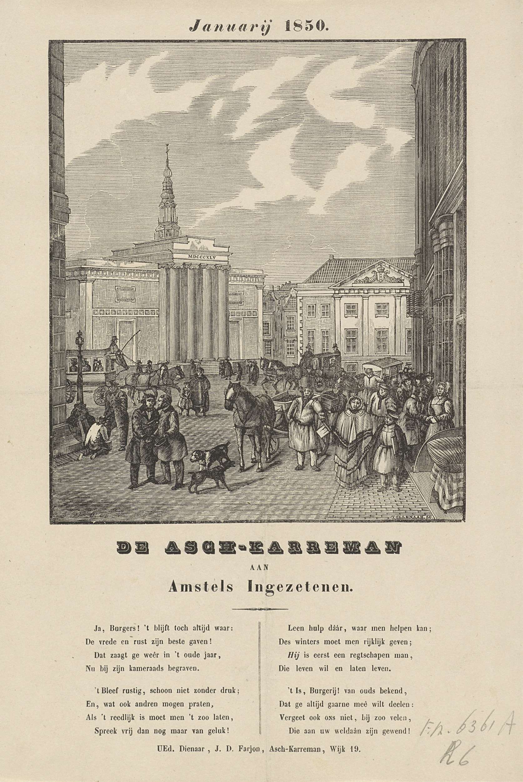 Nieuwjaarswens namens de askarrenmannen (karrenman of vuilnisman) te Amsterdam voor het jaar 1850. Gezicht op de Dam te Amsterdam met de Beurs van Zocher en het Commandantshuis. Tussen het publiek de vuilnismannen met hun kar. Onderaan een gedicht in twee kolommen. Namens J.D. Farjon, de askarreman van wijk no. 19.