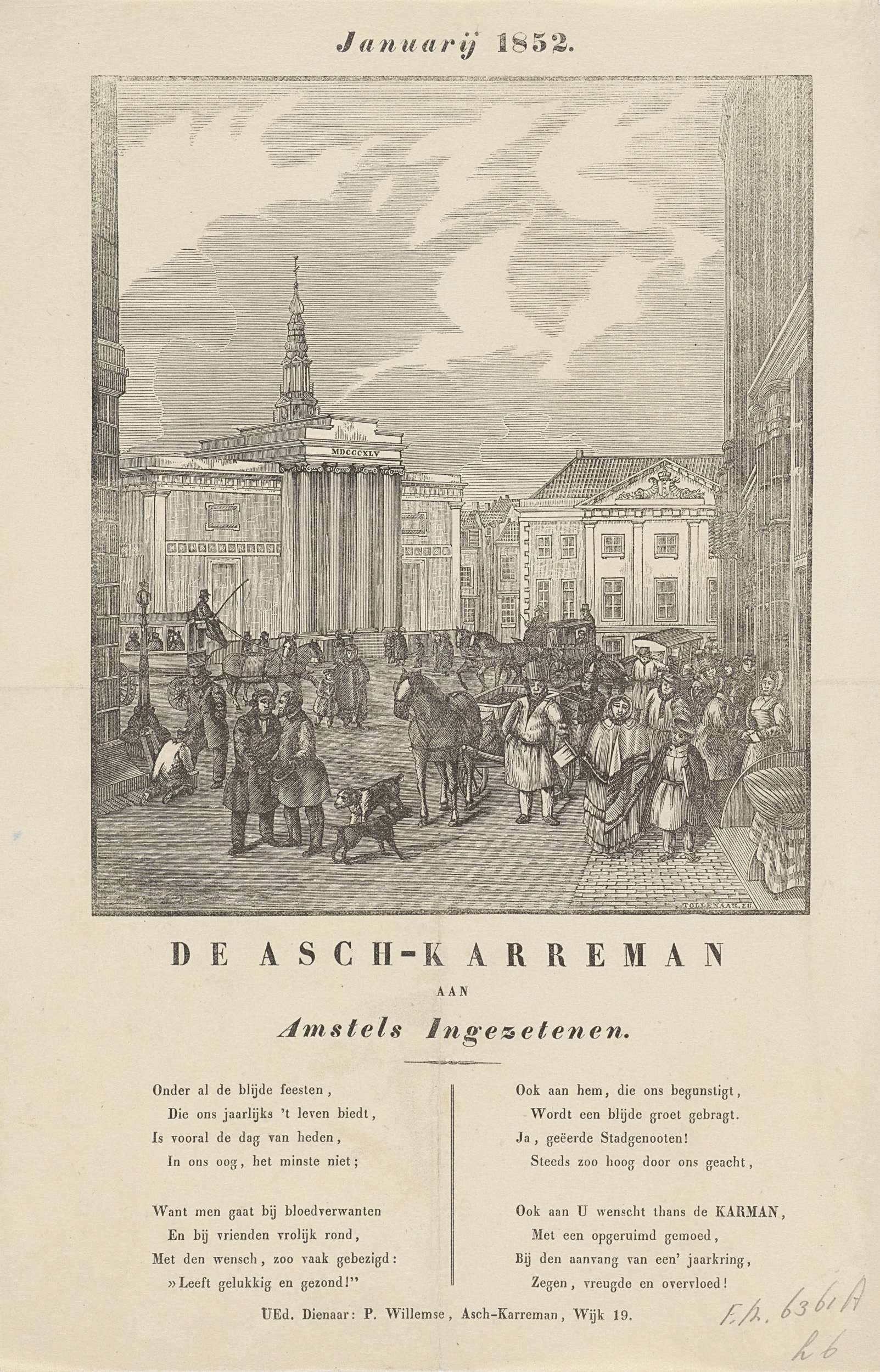 Nieuwjaarswens namens de askarrenmannen (karrenman of vuilnisman) te Amsterdam voor het jaar 1852. Gezicht op de Dam te Amsterdam met de Beurs van Zocher en het Commandantshuis. Tussen het publiek de vuilnismannen met hun kar. Onderaan een gedicht in twee kolommen. Namens P. Willemse, de askarreman van wijk no. 19.