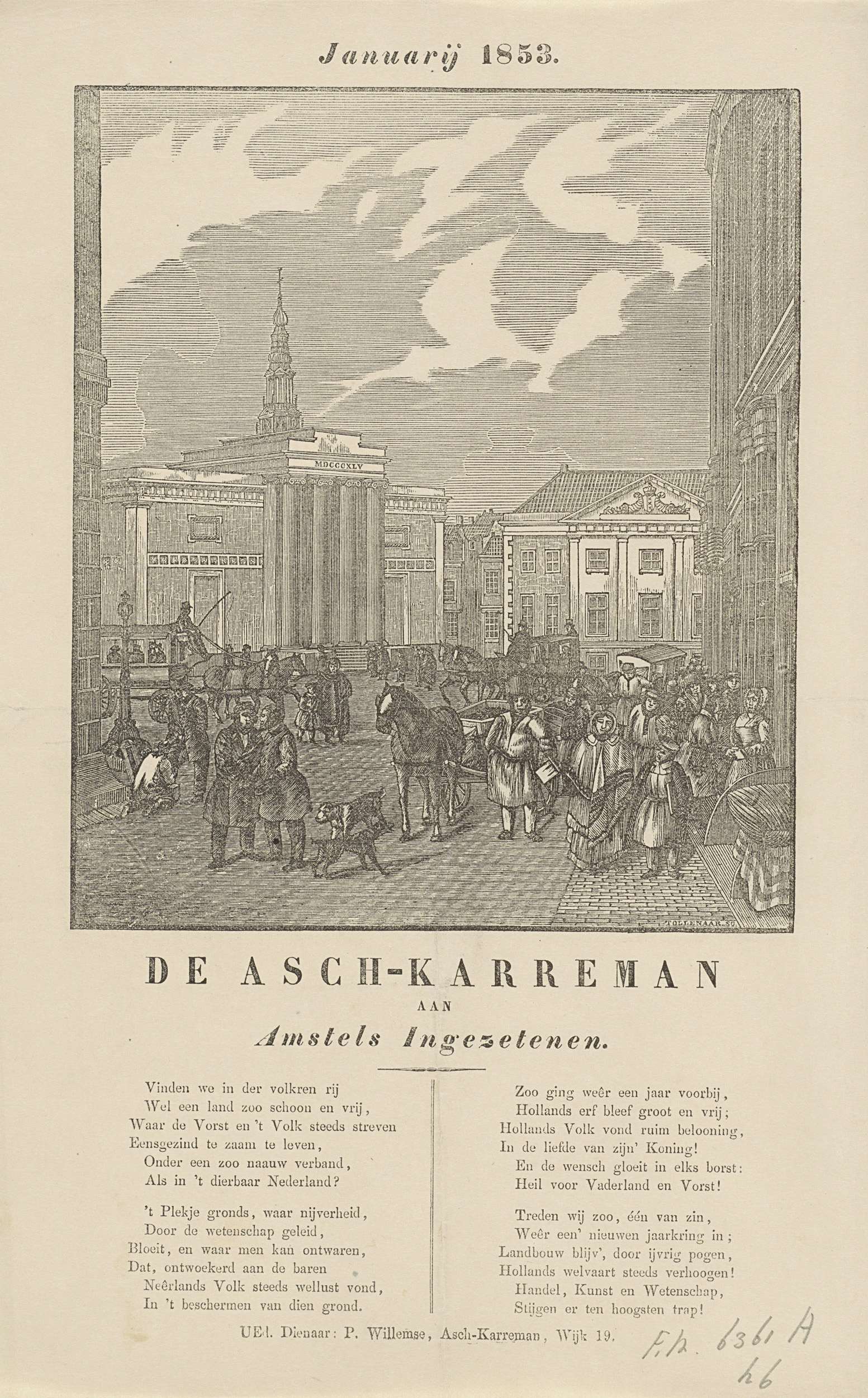 Nieuwjaarswens namens de askarrenmannen (karrenman of vuilnisman) te Amsterdam voor het jaar 1853. Gezicht op de Dam te Amsterdam met de Beurs van Zocher en het Commandantshuis. Tussen het publiek de vuilnismannen met hun kar. Onderaan een gedicht in twee kolommen. Namens P. Willemse, de askarreman van wijk no. 19.