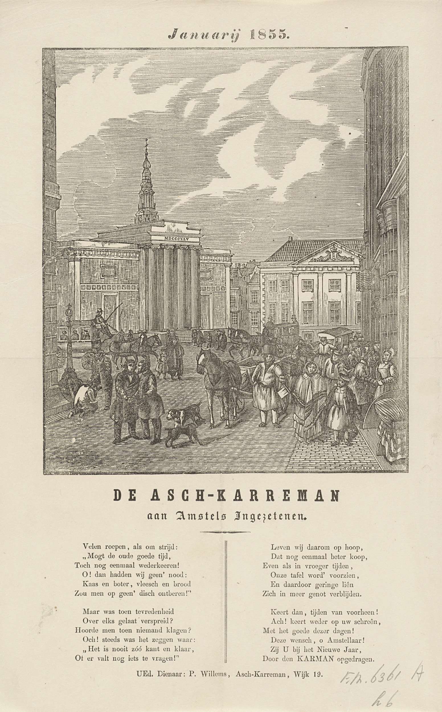 Nieuwjaarswens namens de askarrenmannen (karrenman of vuilnisman) te Amsterdam voor het jaar 1855. Gezicht op de Dam te Amsterdam met de Beurs van Zocher en het Commandantshuis. Tussen het publiek de vuilnismannen met hun kar. Onderaan een gedicht in twee kolommen. Namens P. Willemse, de askarreman van wijk no. 19.