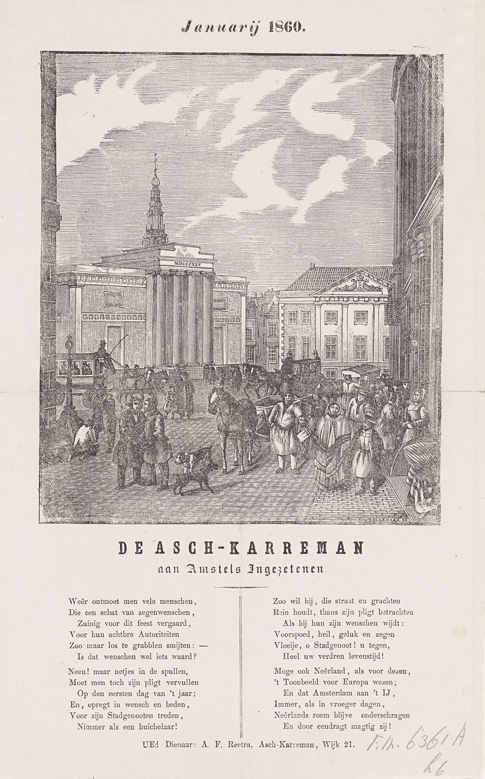 Nieuwjaarswens namens de askarrenmannen (karrenman of vuilnisman) te Amsterdam voor het jaar 1860. Gezicht op de Dam te Amsterdam met de Beurs van Zocher en het Commandantshuis. Tussen het publiek de vuilnismannen met hun kar. Onderaan een gedicht in twee kolommen. Namens A.F. Reetra, de askarreman van wijk no. 21.