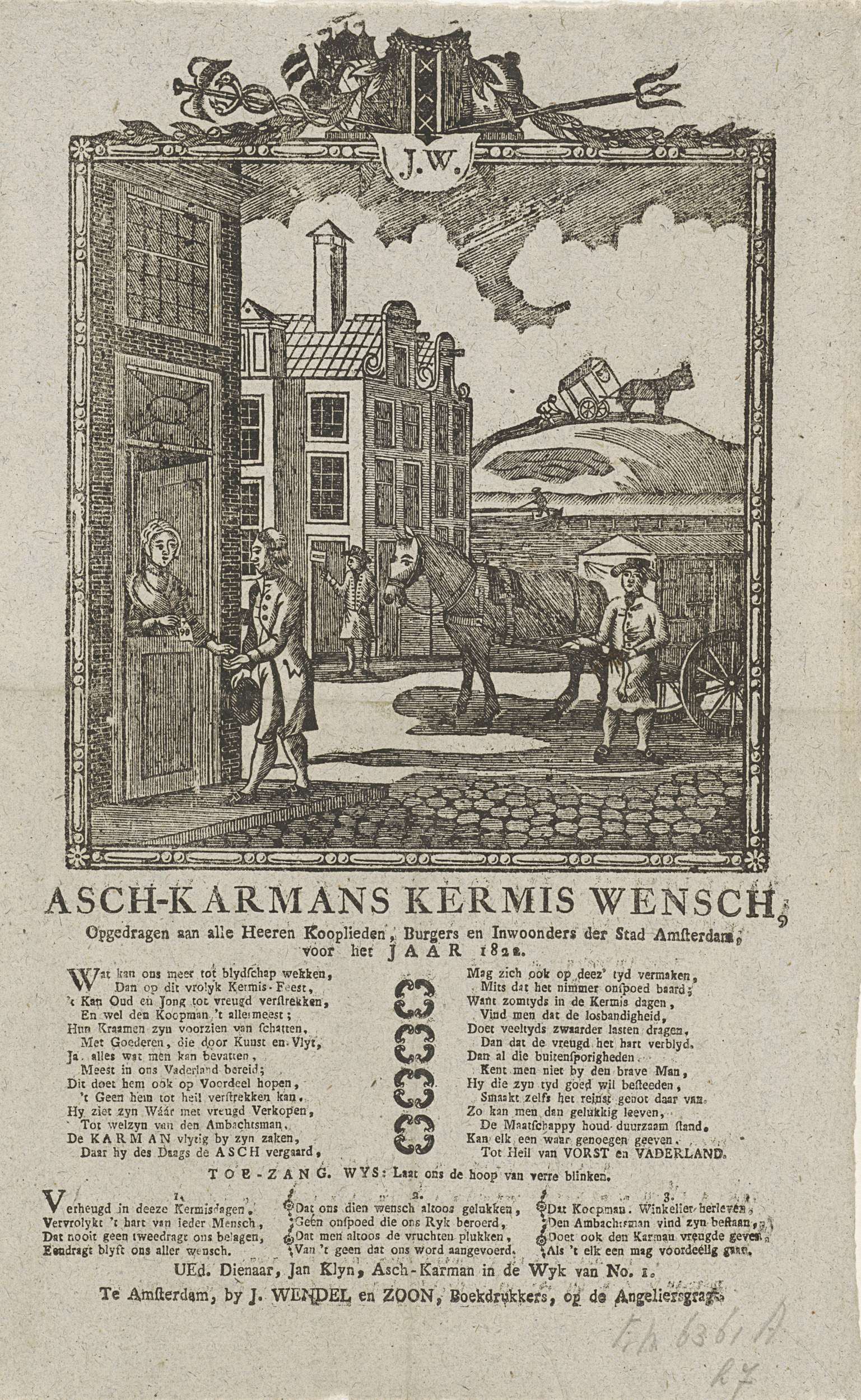 Kermisprent namens de askarrenmannen (karrenman of vuilnisman) te Amsterdam voor het jaar 1822. Gezicht in een straat te Amsterdam met de askar, een jongen met een ratel en een man die aan huis geld ophaalt. Op de achtergrond wordt de kar op de asbelt leeggestort. Onderaan een gedicht in twee kolommen en een lied in ...