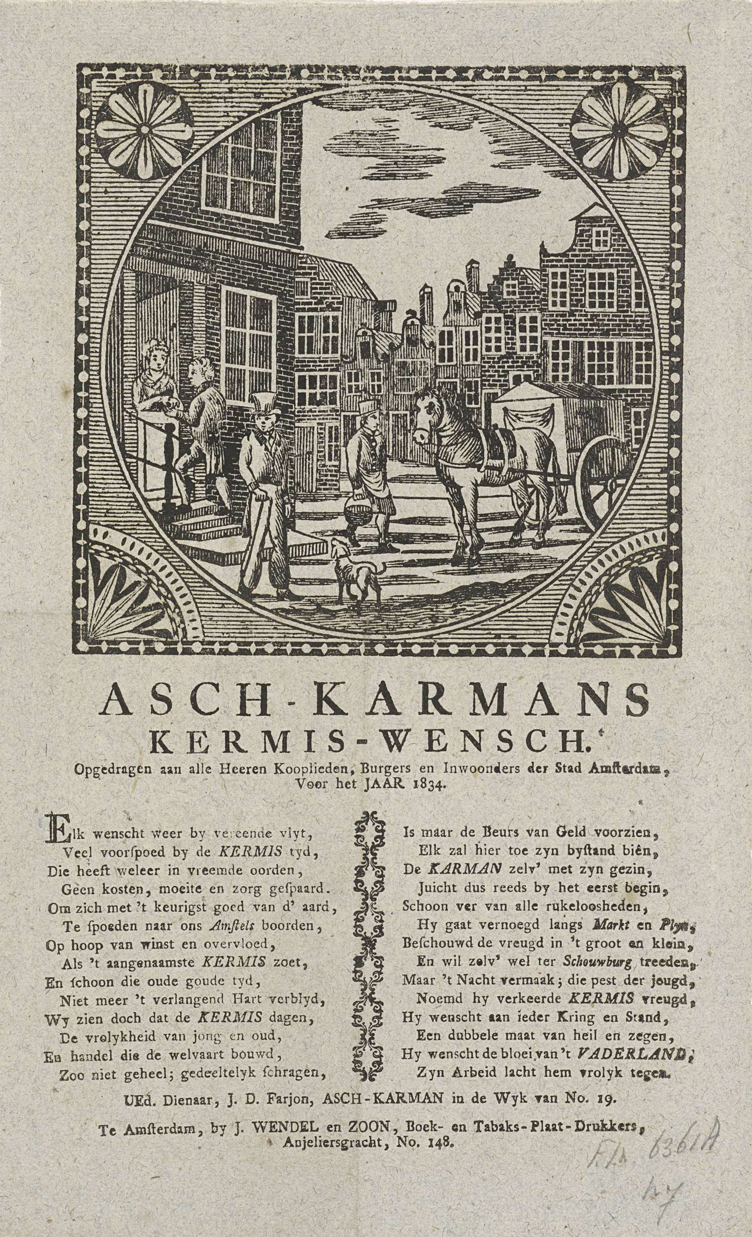 Kermisprent namens de askarrenmannen (karrenman of vuilnisman) te Amsterdam voor het jaar 1834. Gezicht in een straat te Amsterdam met een man die een asemmer naar de kar brengt terwijl een andere man aan huis geld ophaalt. Onderaan een gedicht in twee kolommen. Namens J.D. Farjon, de askarreman van wijk no. 19.