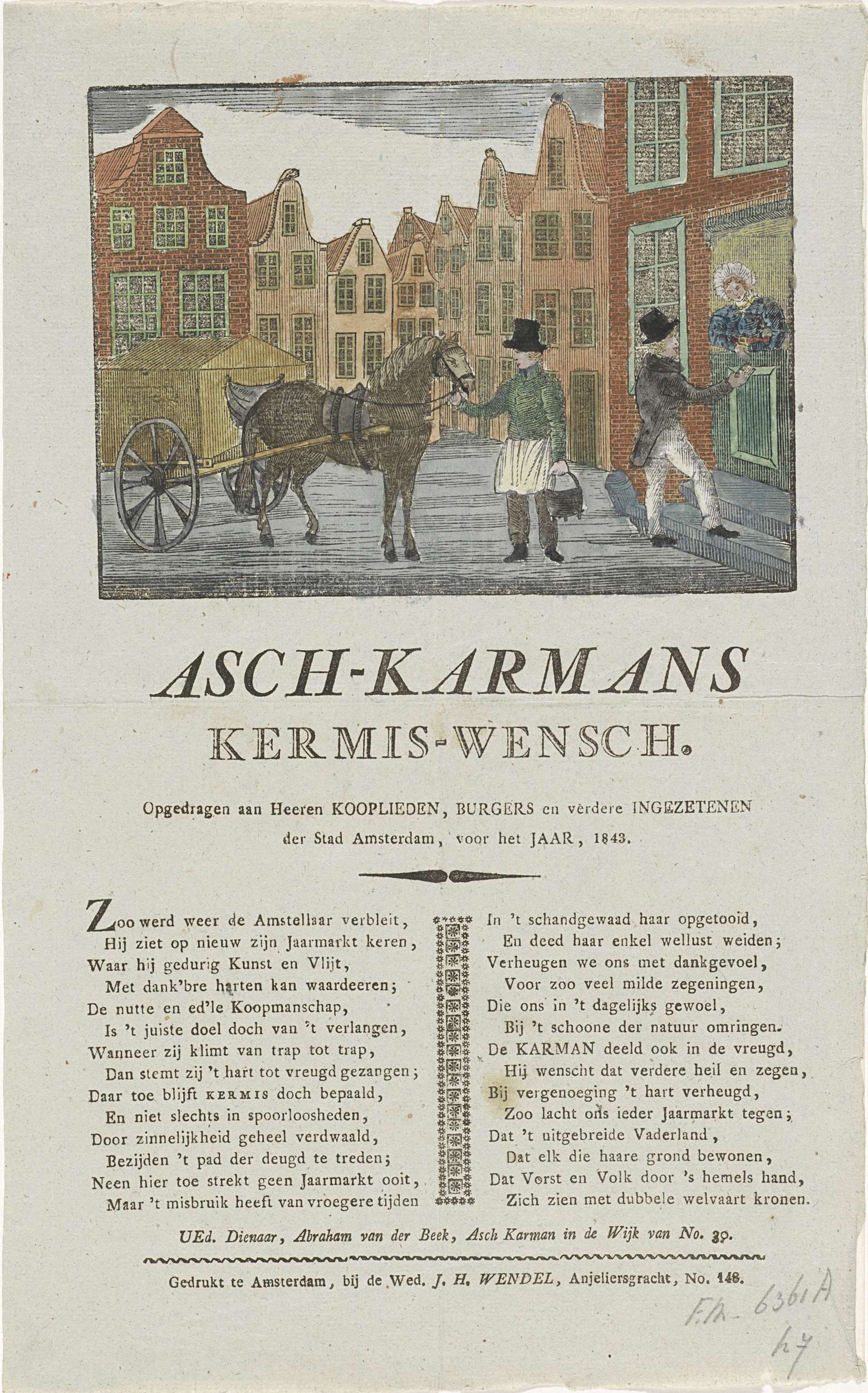 Kermisprent namens de askarrenmannen (karrenman of vuilnisman) te Amsterdam voor het jaar 1843. Gezicht in een straat te Amsterdam met een man staande met een asemmer bij de kar terwijl een andere man aan huis geld ophaalt. Onderaan een gedicht in twee kolommen. Namens Abraham van der Beek, de askarreman van wijk no. 30.