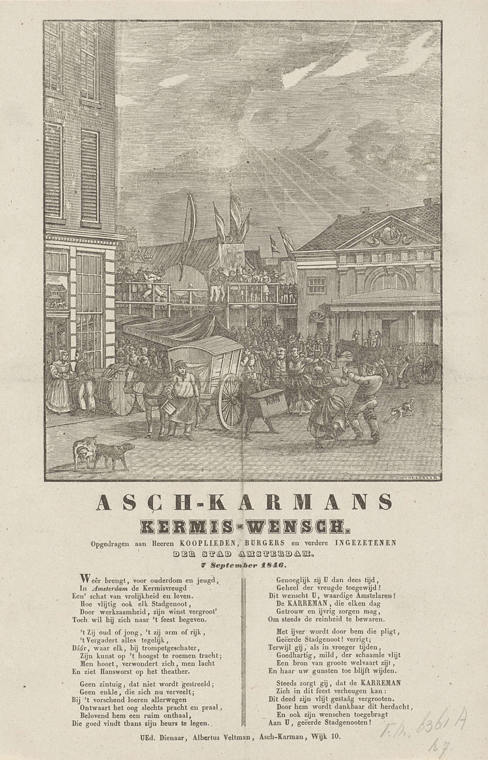 Kermisprent namens de askarrenmannen (karrenman of vuilnisman) te Amsterdam, 7 september 1846. Gezicht op de kermis op de Botermarkt met de Regulierswaag. Op de markt twee vuilniskarren. Onderaan een gedicht in twee kolommen. Namens Albertus Veltman, de askarreman van wijk no. 10.