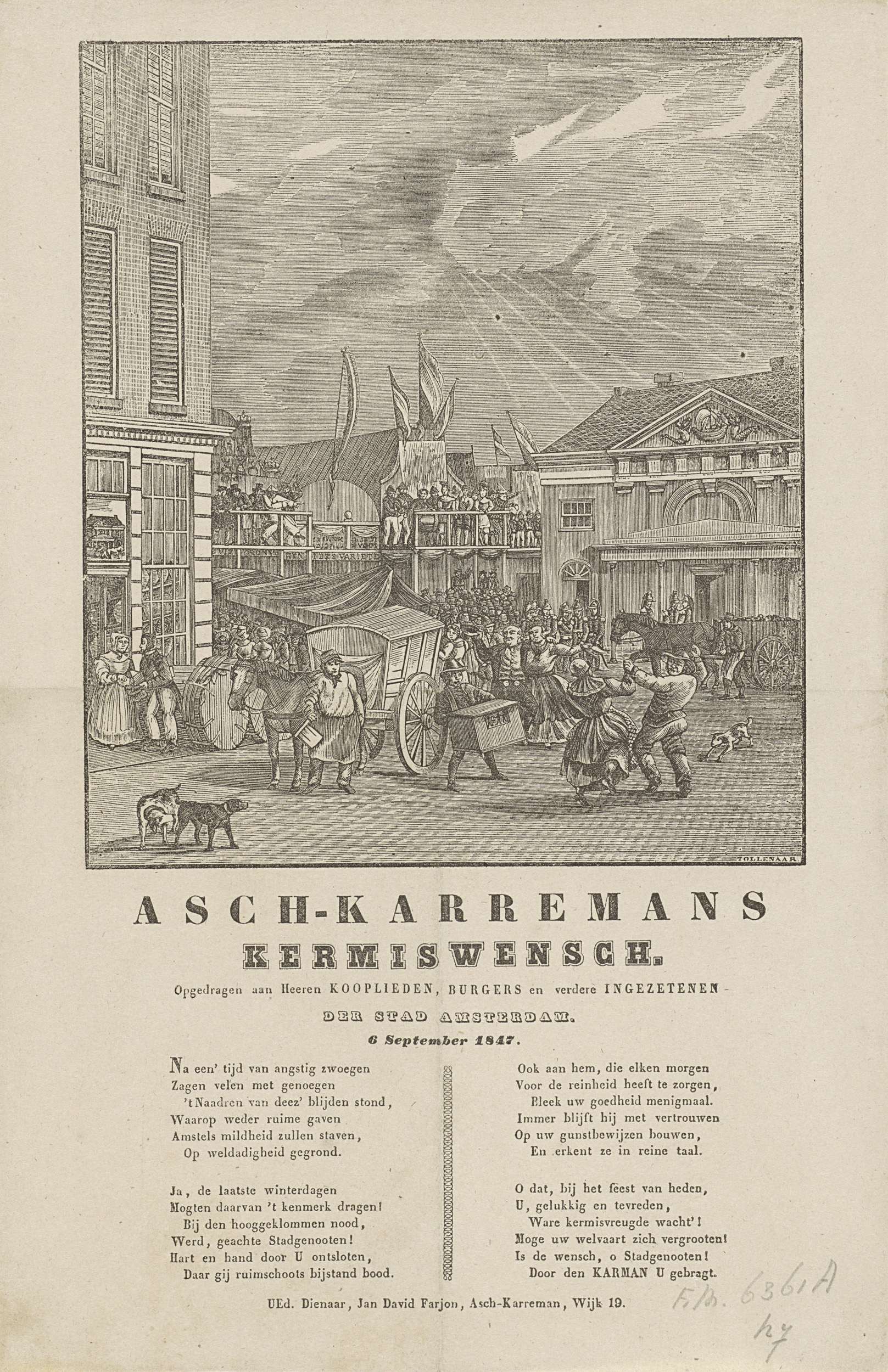 Kermisprent namens de askarrenmannen (karrenman of vuilnisman) te Amsterdam, 6 september 1847. Gezicht op de kermis op de Botermarkt met de Regulierswaag. Op de markt twee vuilniskarren. Onderaan een gedicht in twee kolommen. Namens Jan David Farjon, de askarreman van wijk no. 19.
