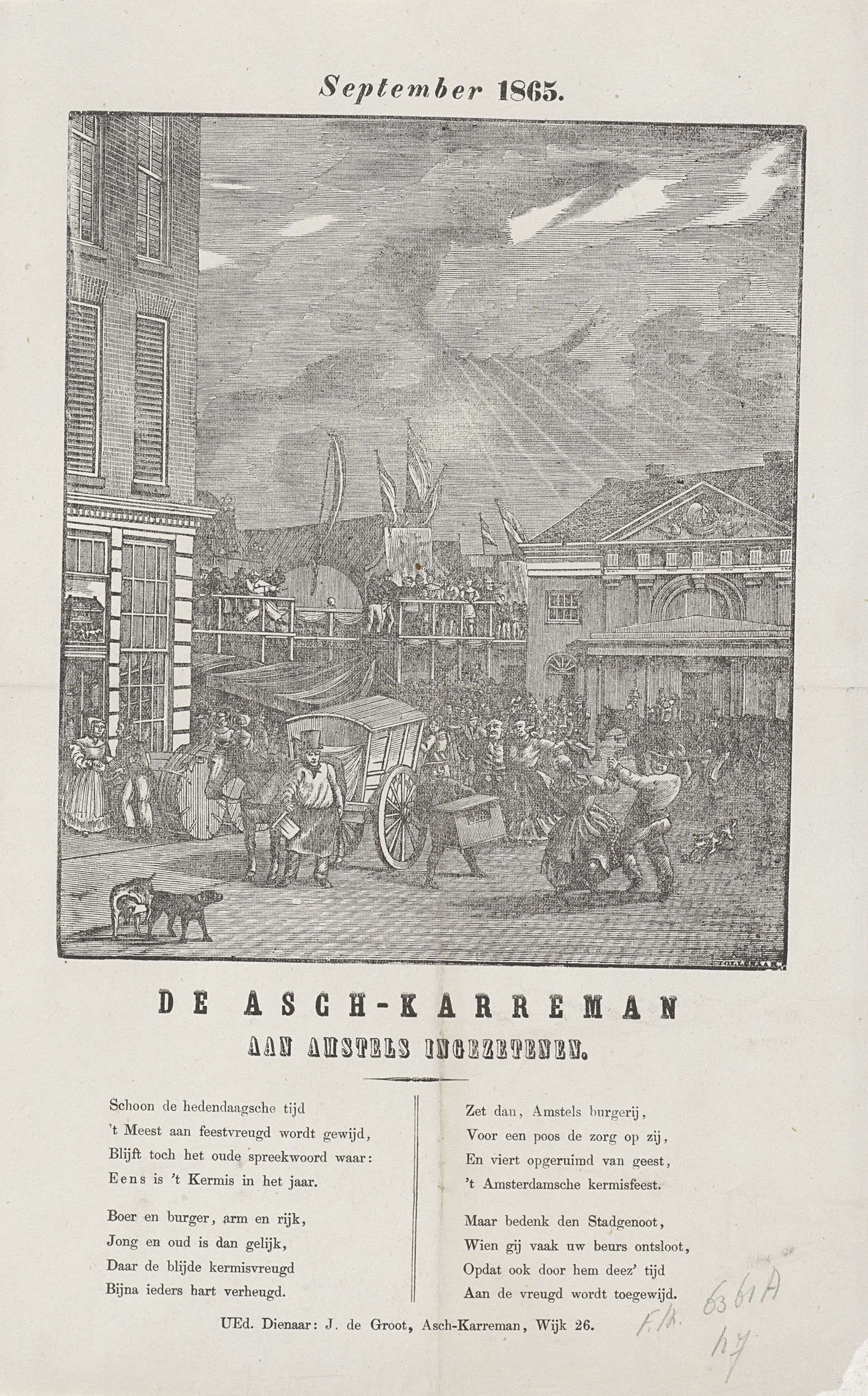 Kermisprent namens de askarrenmannen (karrenman of vuilnisman) te Amsterdam, september 1865. Gezicht op de kermis op de Botermarkt met de Regulierswaag. Op de markt twee vuilniskarren. Onderaan een gedicht in twee kolommen. Namens J. de Groot, de askarreman van wijk no. 26.