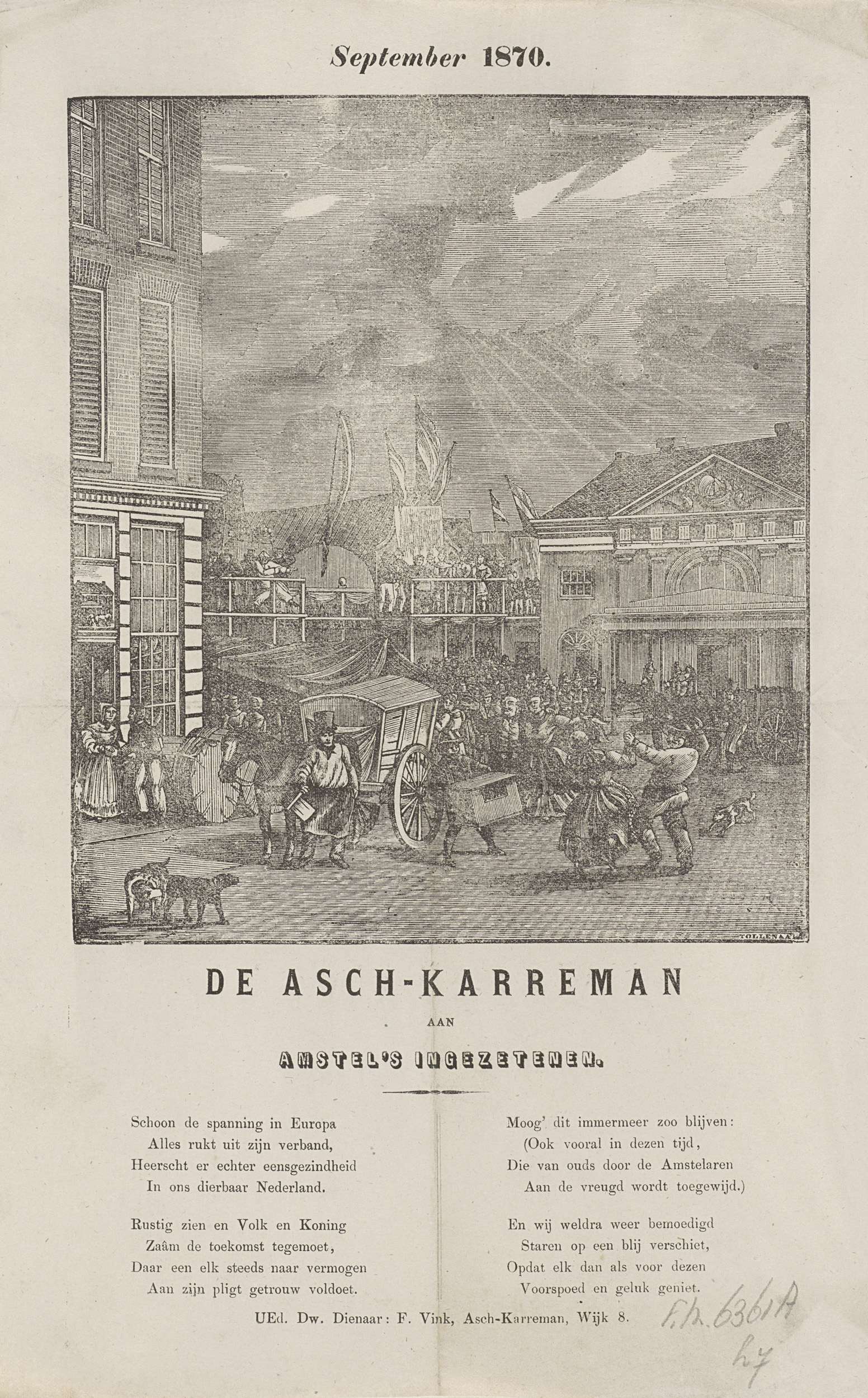 Kermisprent namens de askarrenmannen (karrenman of vuilnisman) te Amsterdam, september 1870. Gezicht op de kermis op de Botermarkt met de Regulierswaag. Op de markt twee vuilniskarren. Onderaan een gedicht in twee kolommen. Namens F. Vink, de askarreman van wijk no. 8.