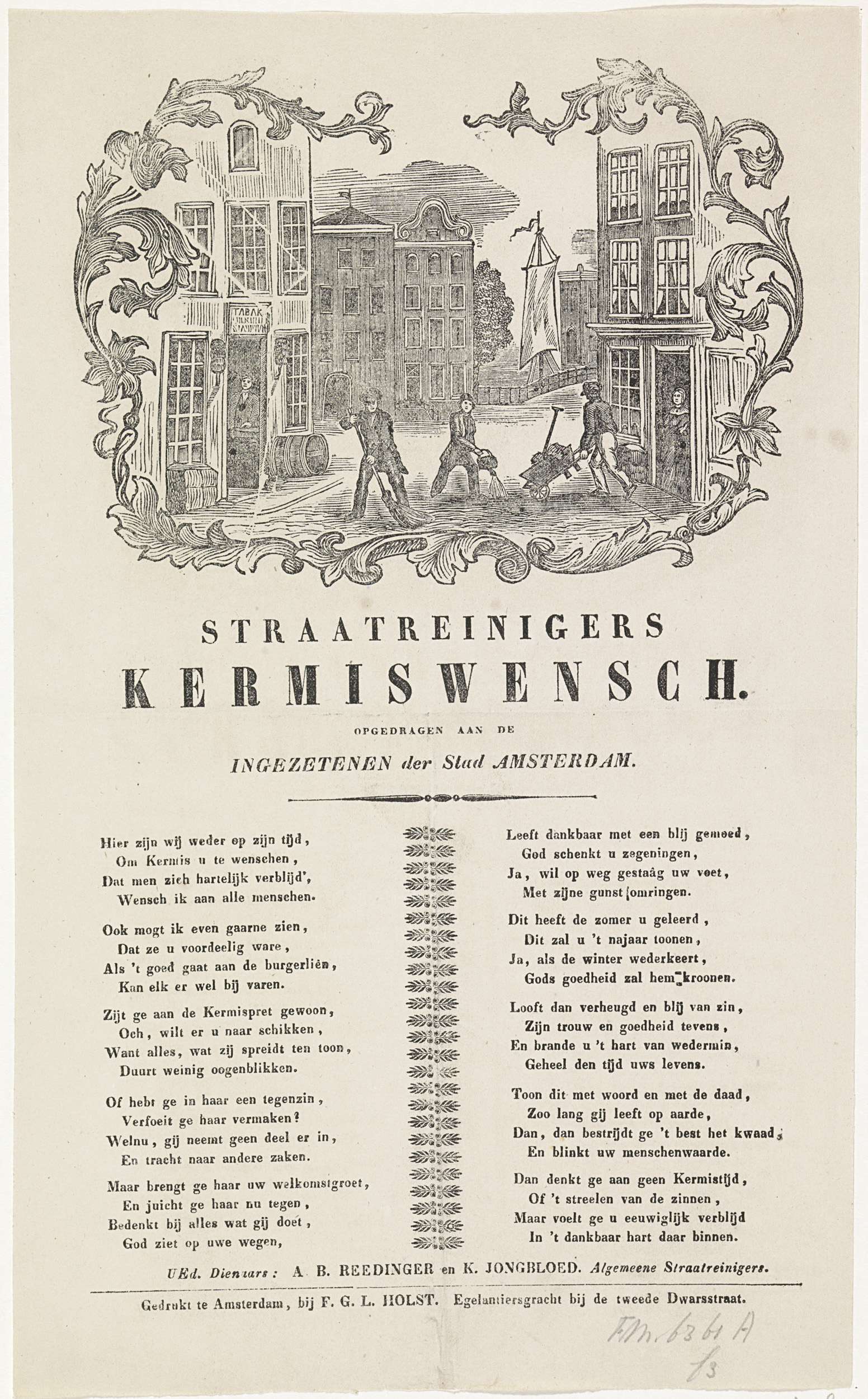 Kermisprent van de Amsterdamse straatvegers, ca. 1855-1861. Gezicht in een straat te Amsterdam, waar twee straatvegers aan het werk zijn. Met een vers in twee kolommen. Namens de straatvegers: A.B. Reedinger en K. Jongbloed.
