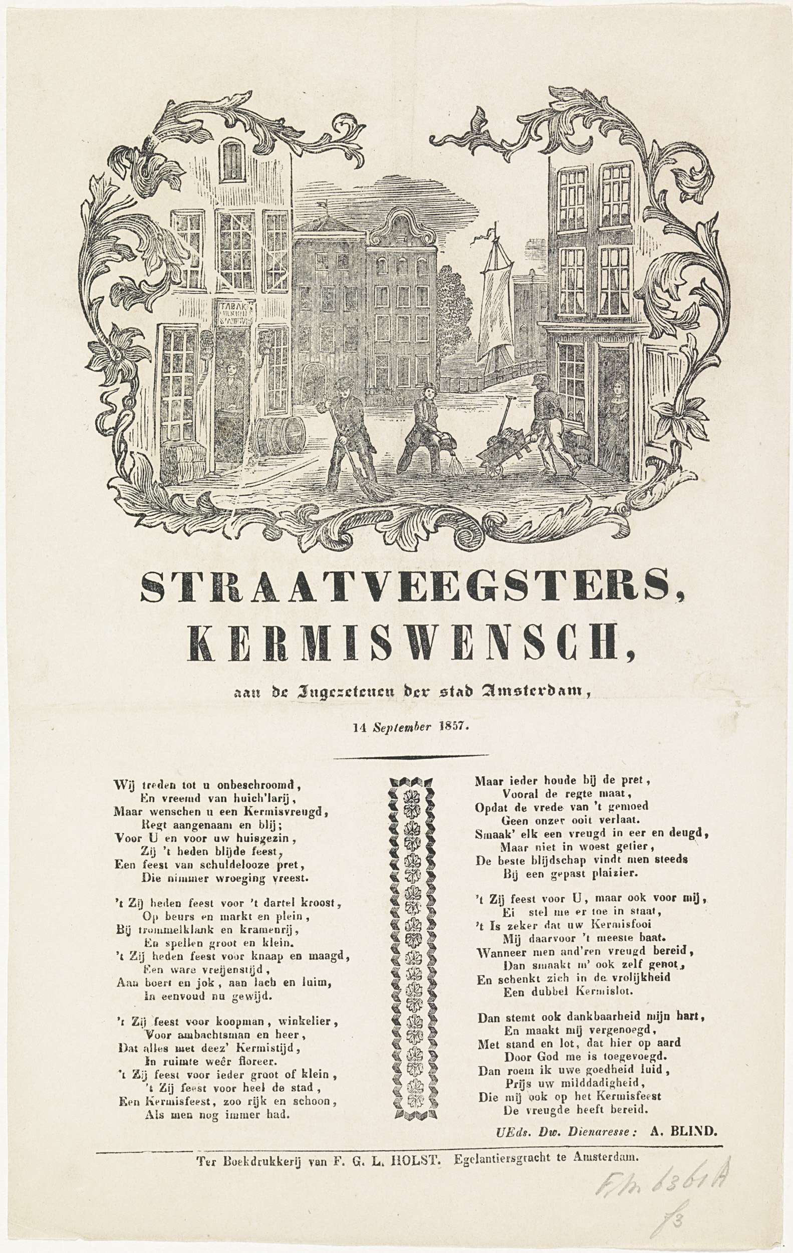 Kermisprent van de Amsterdamse straatveegsters, 14 september 1857. Gezicht in een straat te Amsterdam, waar twee straatvegers aan het werk zijn. Met een vers in twee kolommen. Namens de straatveegster: A. Blind.
