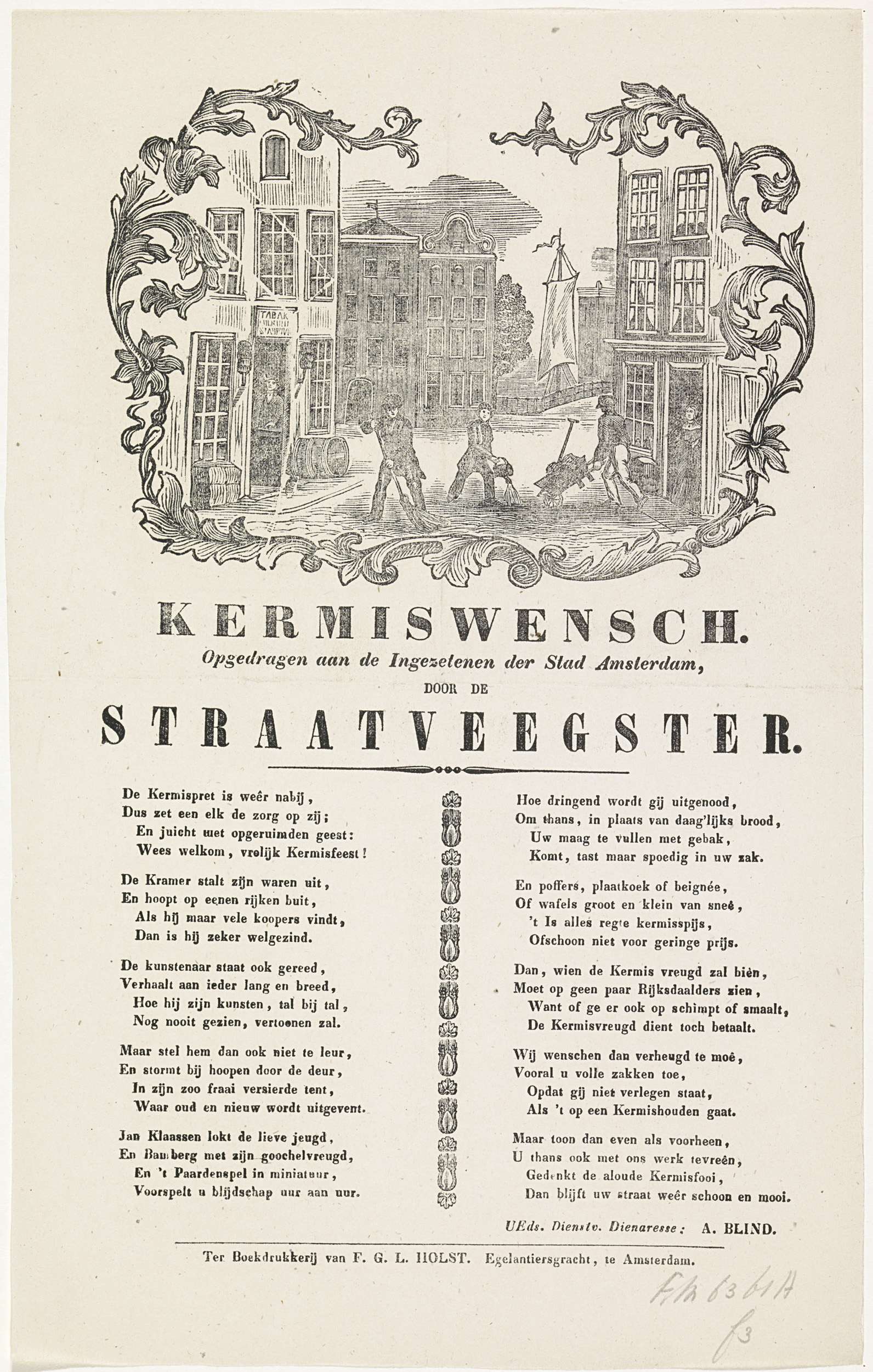 Kermisprent van de Amsterdamse straatveegsters, ca. 1855-1860. Gezicht in een straat te Amsterdam, waar twee straatvegers aan het werk zijn. Met een vers in twee kolommen. Namens de straatveegster: A. Blind.