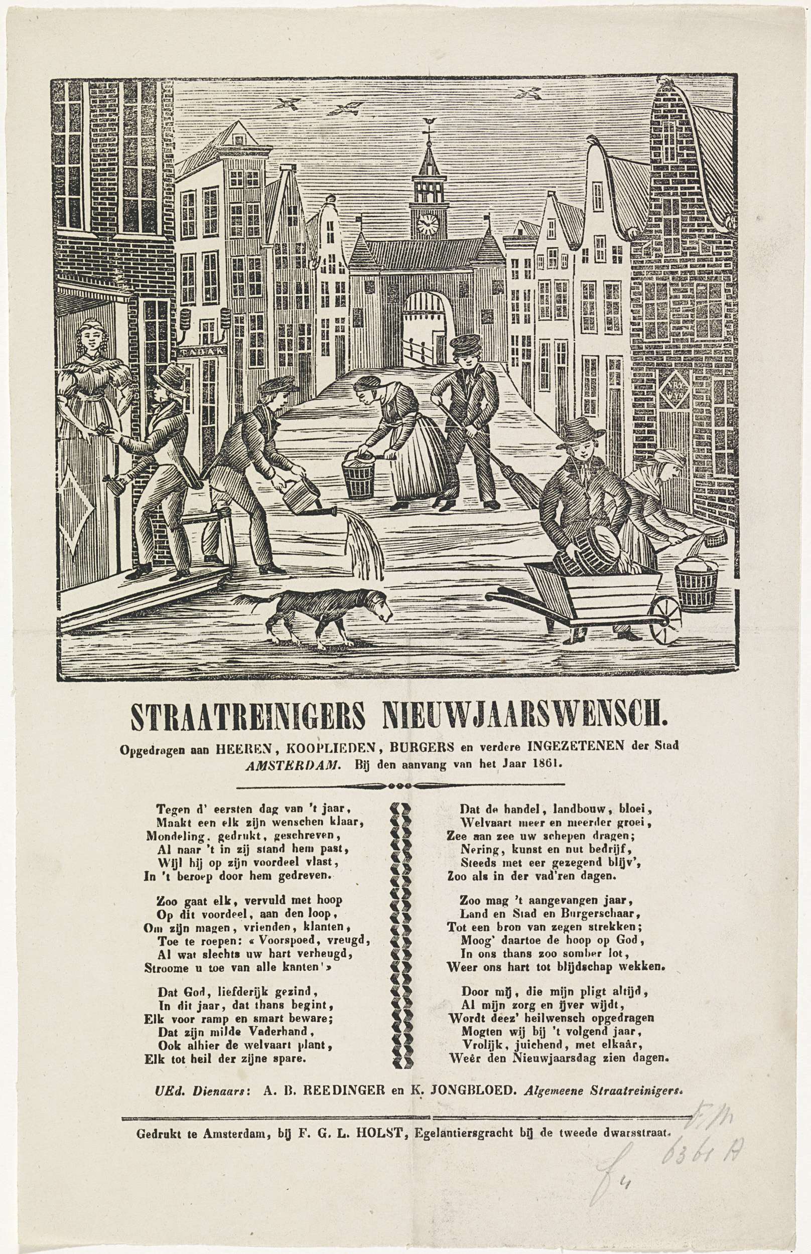 Nieuwjaarswens van de Amsterdamse straatvegers voor het jaar 1861. Gezicht in de Leidsestraat te Amsterdam met de Leidsepoort, waar meerdere mannelijke en vrouwelijke stratenvegers aan het werk zijn, op de voorgrond haalt een man geld op bij een huis. Met een vers in twee kolommen. Namens de straatvegers: A.B. Reedinger en K. Jongbloed.