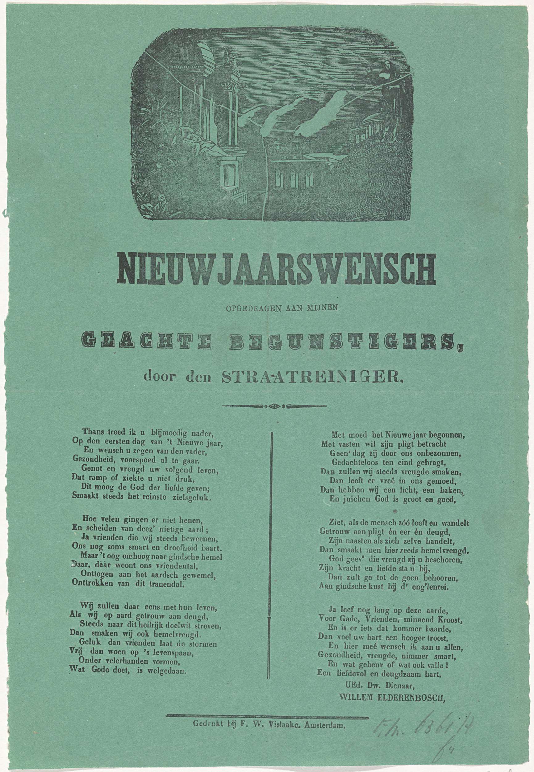 Nieuwjaarswens van de Amsterdamse straatvegers, ca. 1860-1880. Bovenaan een illustatie aan een boek ontleend: tempel tussen bergen. Met een vers in twee kolommen. Namens de straatveger: Willem Elderenbosch.