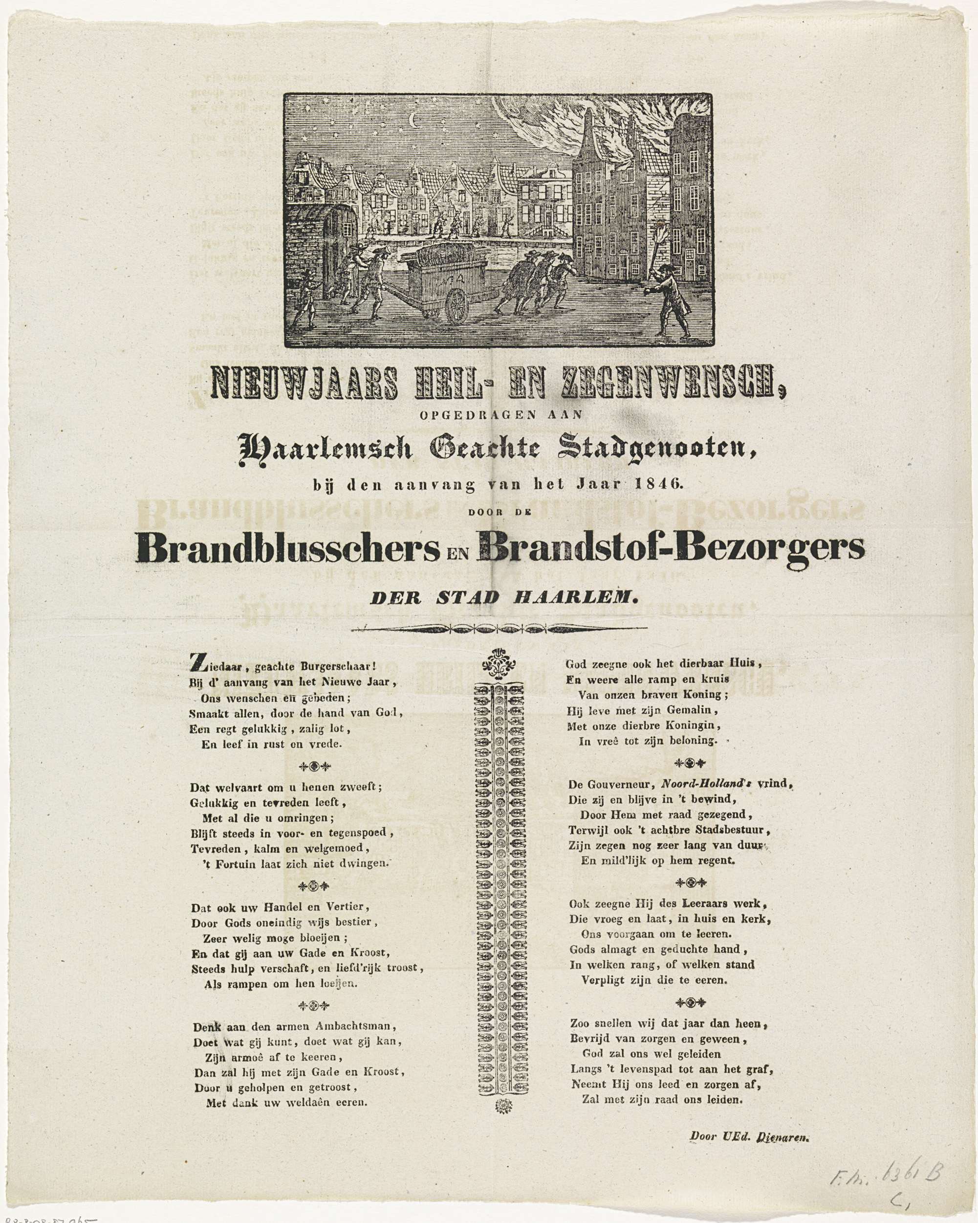 Nieuwjaarswens van de brandblussers en brandstofbezorgers van Haarlem voor het jaar 1846