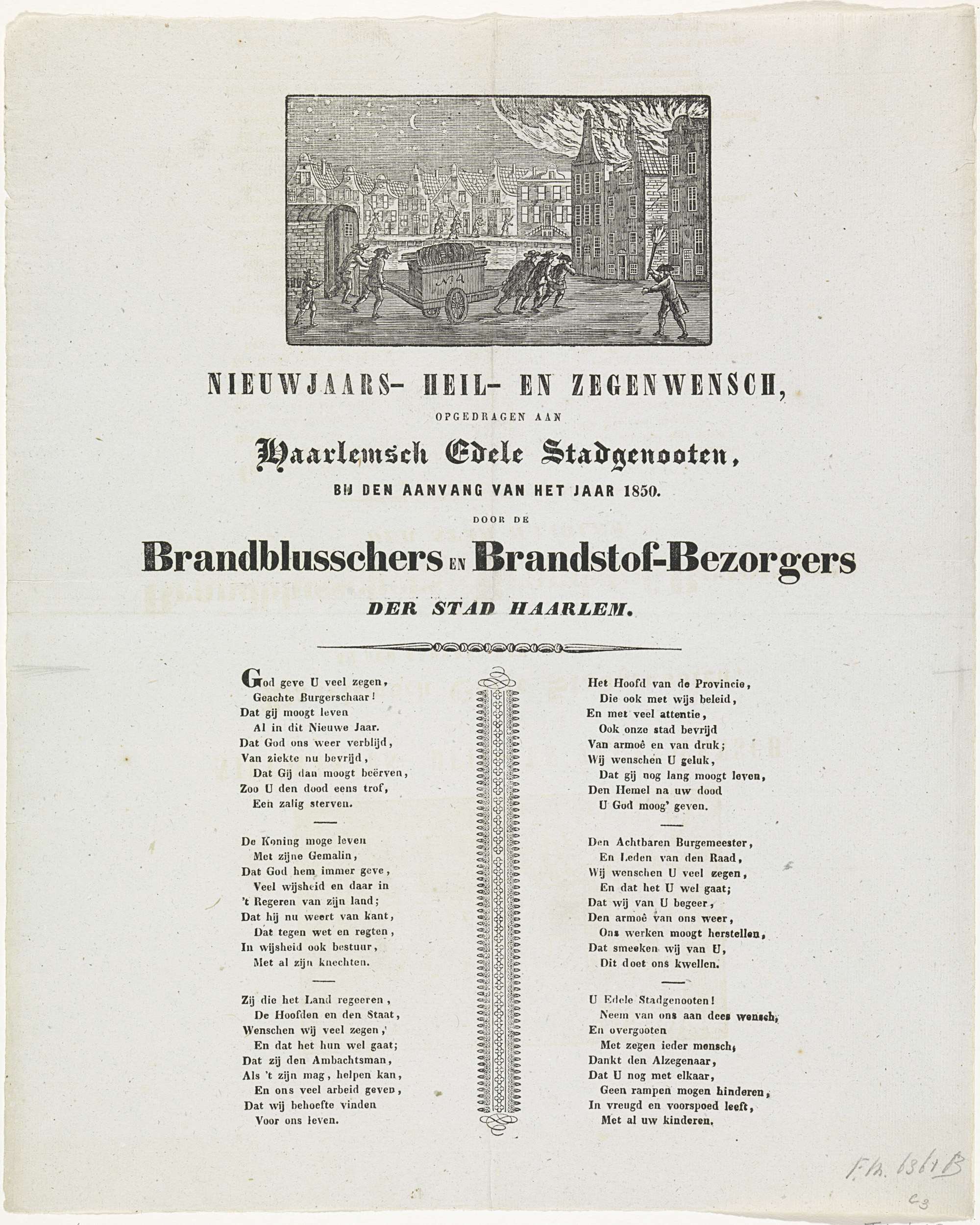 Nieuwjaarswens van de brandblussers en brandstofbezorgers van Haarlem voor het jaar 1850