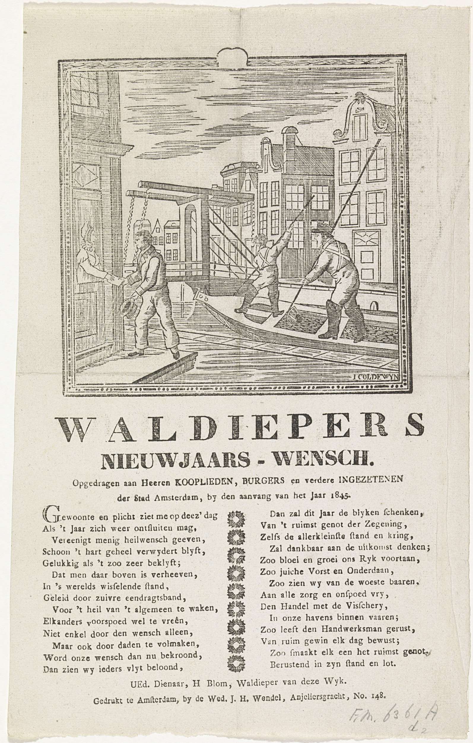 Nieuwjaarswens van de Amsterdamse waldiepers (baggeraars) voor het jaar 1845. Gezicht op een Amsterdamse gracht waar twee mannen in een schuit bezig zijn de gracht uit te diepen, een andere man haalt bij een huis geld op. Met een vers in twee kolommen. Namens de waldieper H. Blom.