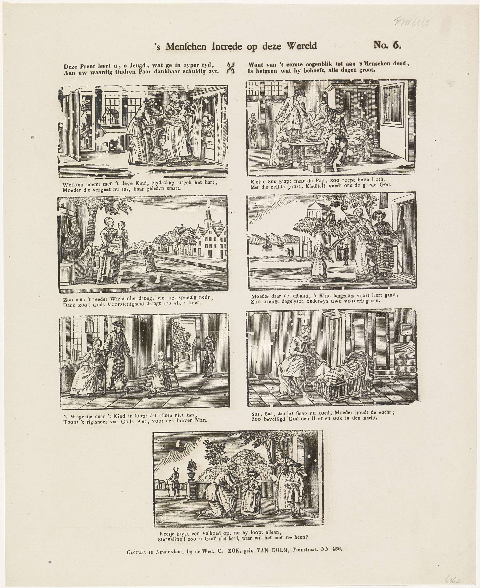 Blad met zeven voorstellingen van de kindertijd, vanaf geboorte tot leren lopen met een valhoed op. Onder elk plaatje een tweeregelig versje. Ca. 1800-1850. Genummerd rechtsboven: No. 6.
