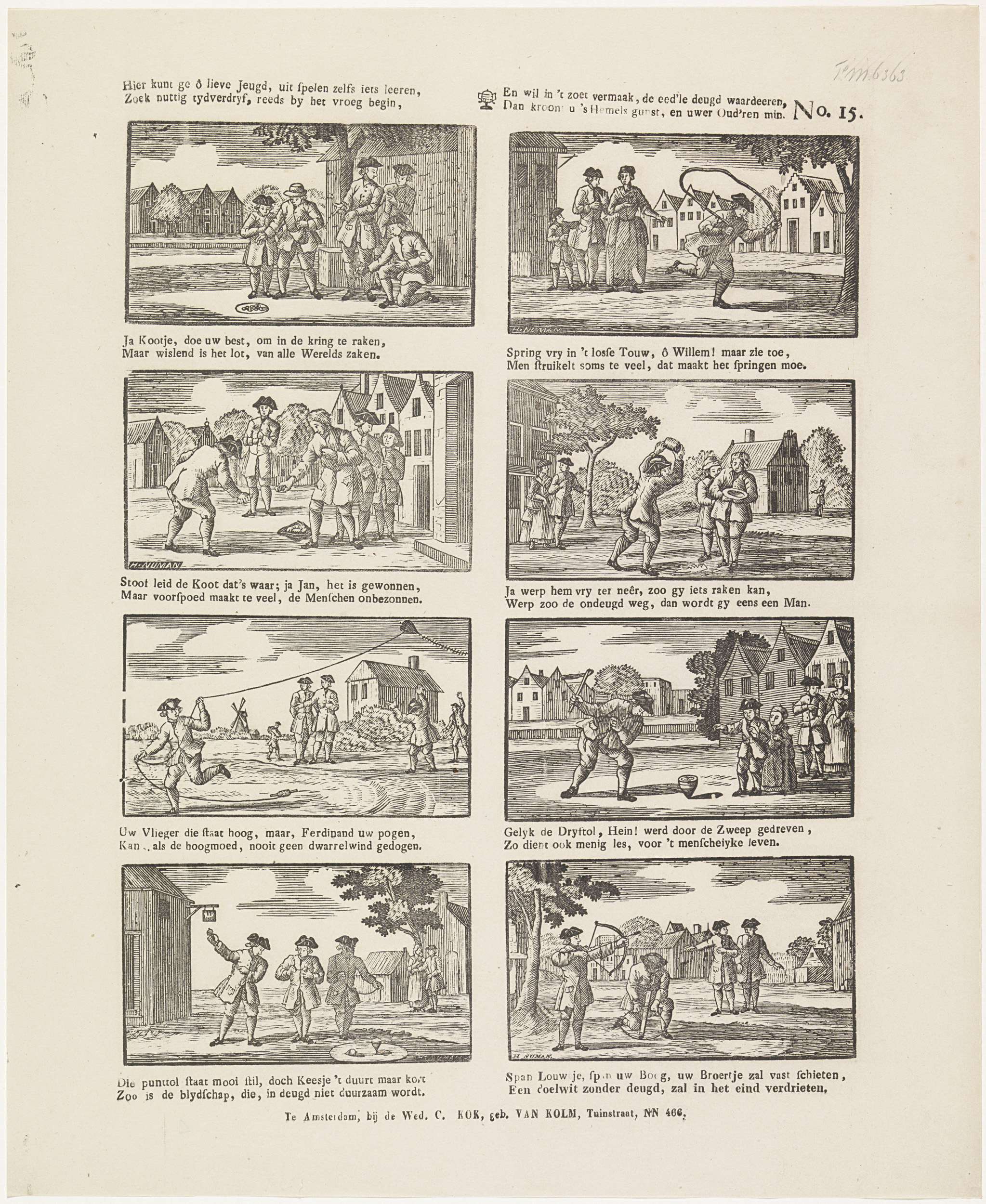 Blad met acht voorstellingen van spelen en tijdsverdrijf tijdens de kindertijd. Onder elk plaatje een tweeregelig versje. Ca. 1800-1850. Genummerd rechtsboven: No. 15.