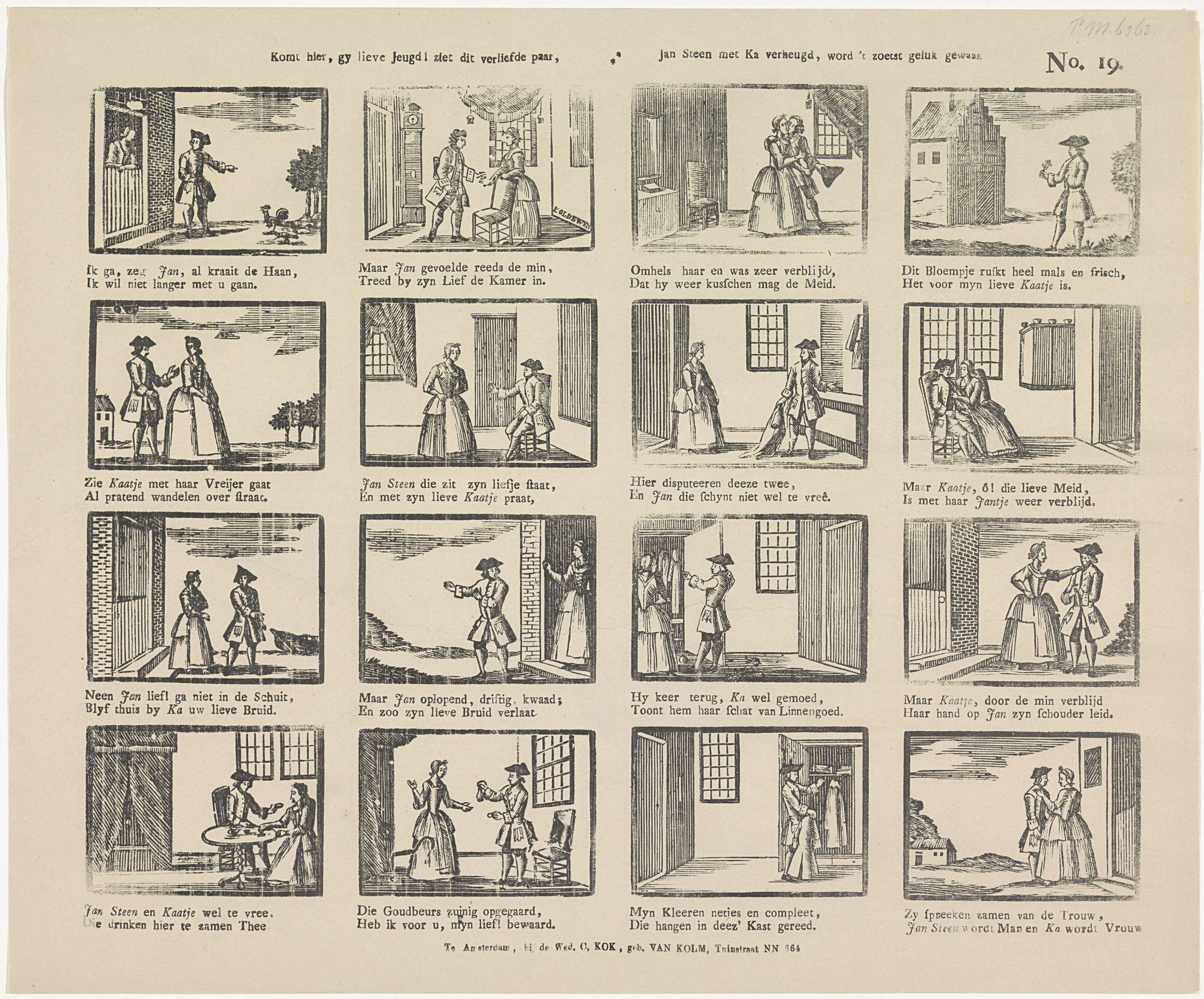 Blad met zestien voorstellingen van de vrijage van Jan Steen en Kaatje. Onder elk plaatje een tweeregelig versje. Ca. 1800-1850. Genummerd rechtsboven: No. 19.
