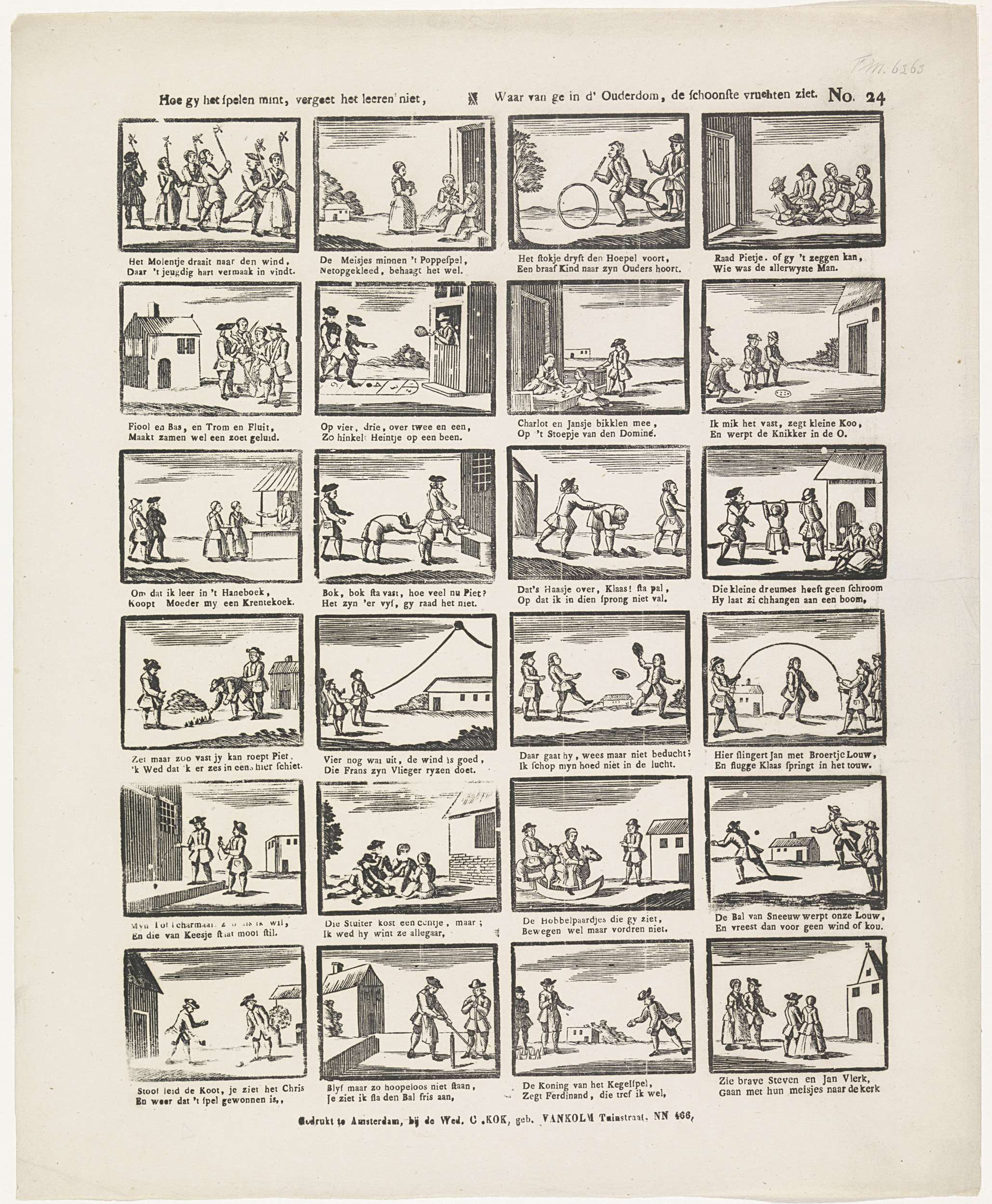 Blad met 24 voorstellingen van kinderspelen. Onder elk plaatje een tweeregelig versje. Ca. 1800-1850. Genummerd rechtsboven: No. 24.