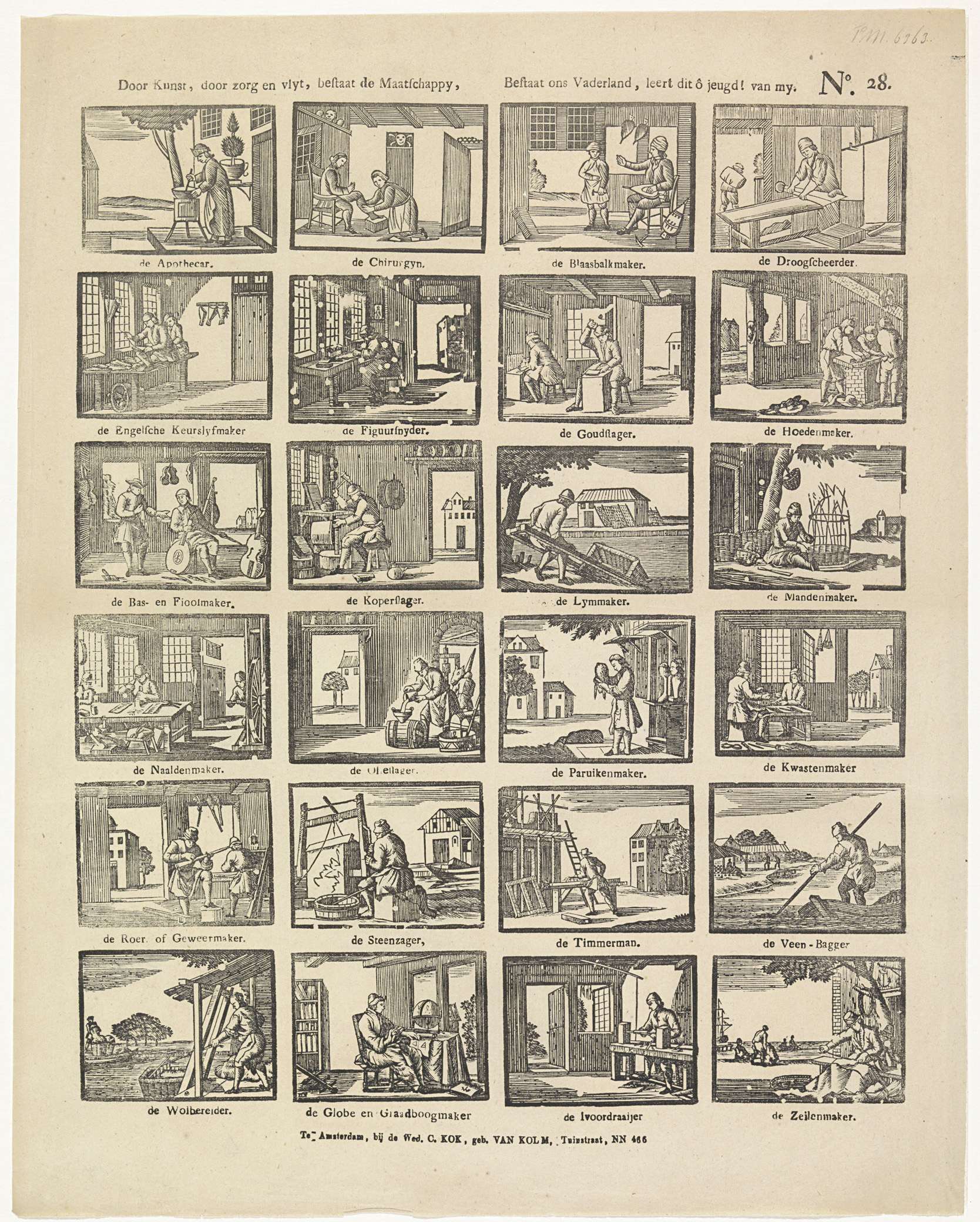 Blad met 24 voorstellingen met een ABC van verschillende beroepen, van apotheker tot zeilmaker. Onder elk plaatje de naam van het beroep. Ca. 1800-1850. Genummerd rechtsboven: No. 28.