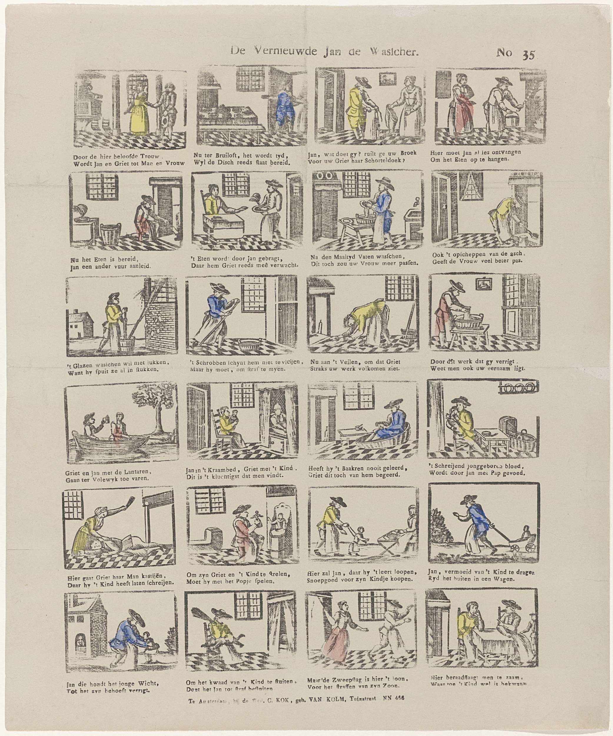Blad met 24 voorstellingen van het leven van Jan de Wasscher, een man die van zijn vrouw - die de broek aan heeft - al het huishoudelijk werk moet doen. Onder elk plaatje een tweeregelig versje. Ca. 1800-1850. Genummerd rechtsboven: No. 35.