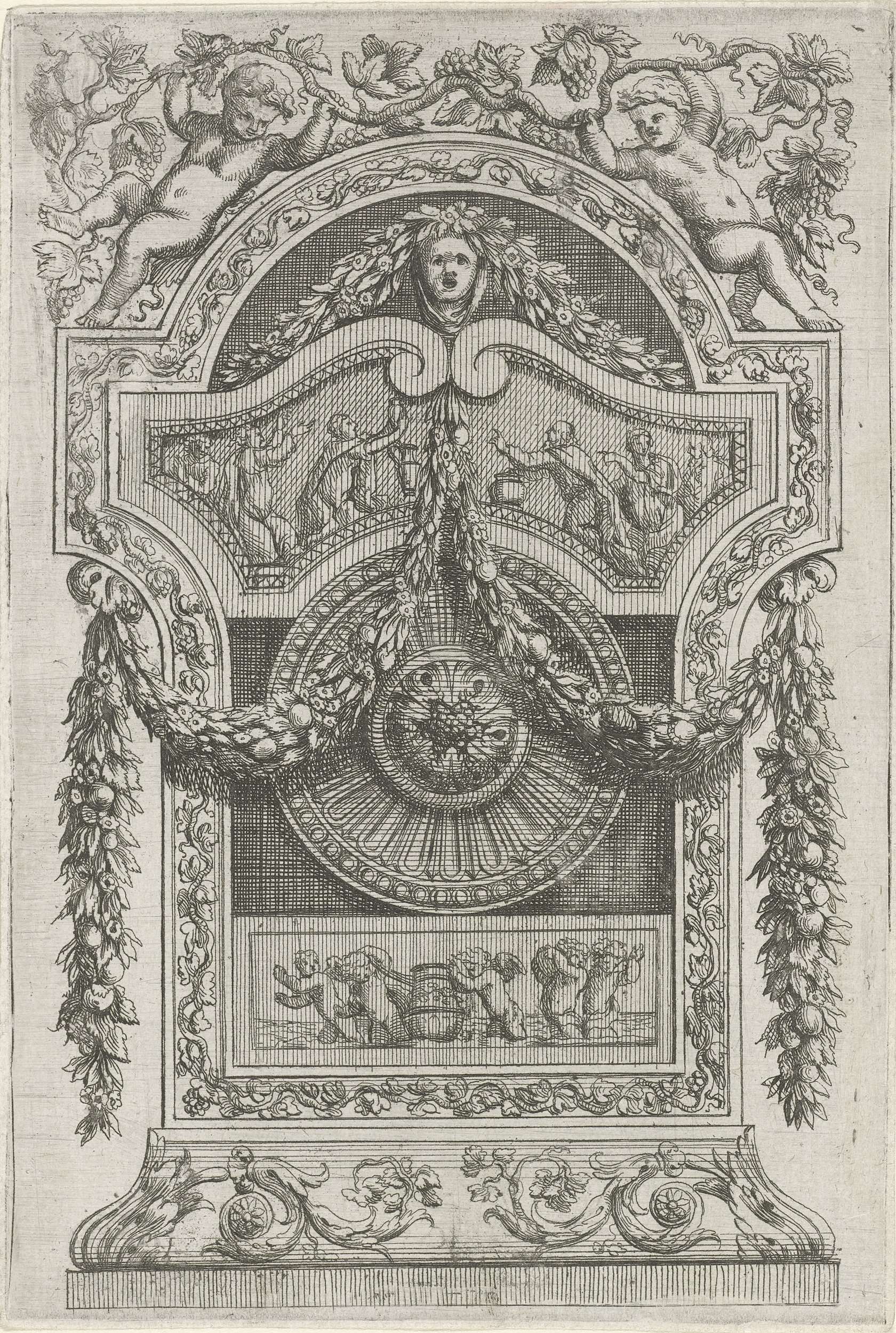 Bovenop staan twee putti met een wijnrank. Uit serie van 12 bladen met ornamentele panelen opgebouwd uit medaillons, tabletten, friezen, sarcofagen, vazen, schilden, guirlandes, klimplanten en putti, geplaatst langs een verticale as. Uit eerste editie.