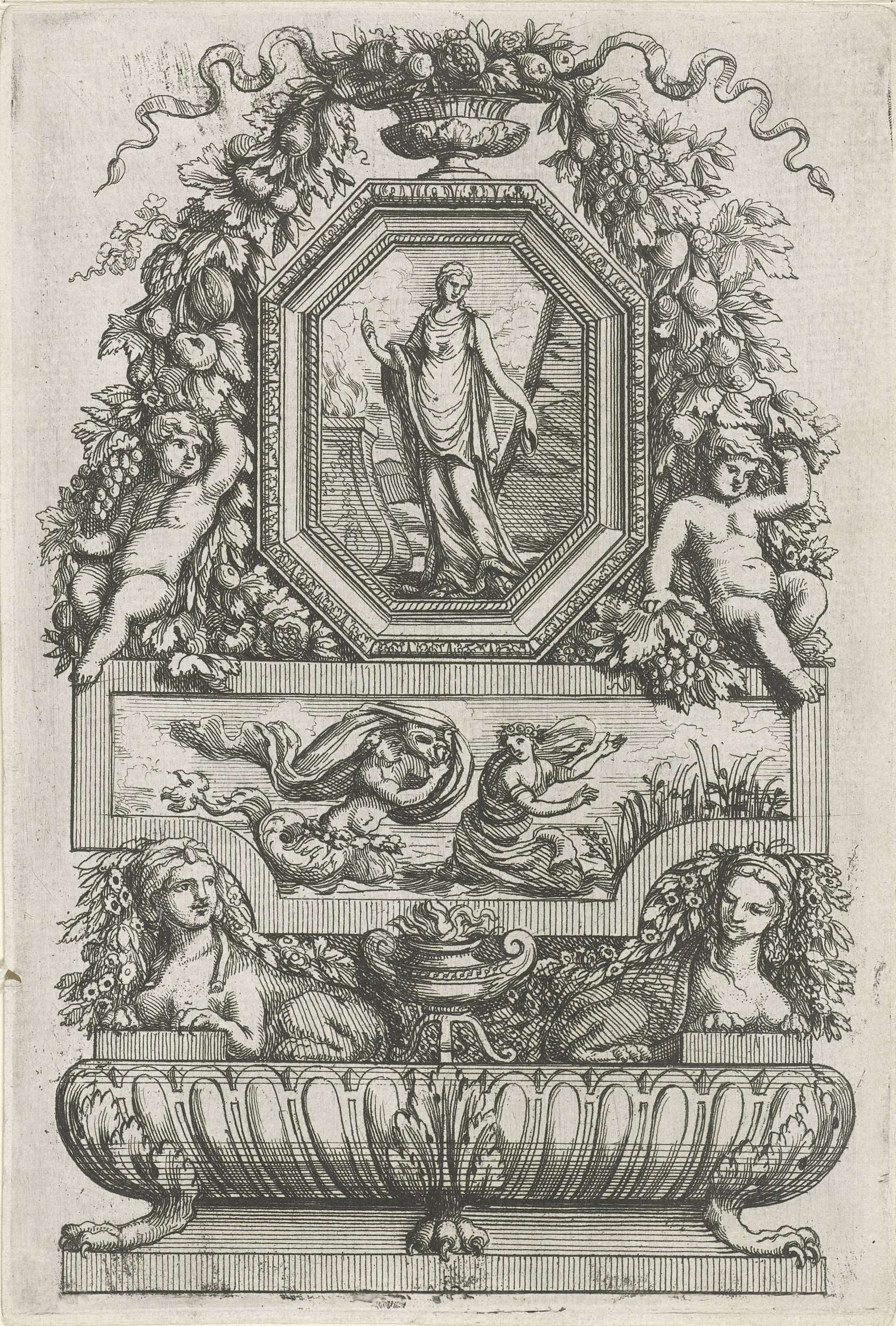 Bovenaan staat een vrouw in een achthoekige lijst afgebeeld. Uit serie van 12 bladen met ornamentele panelen opgebouwd uit medaillons, tabletten, friezen, sarcofagen, vazen, schilden, guirlandes, klimplanten en putti, geplaatst langs een verticale as. Uit eerste editie.