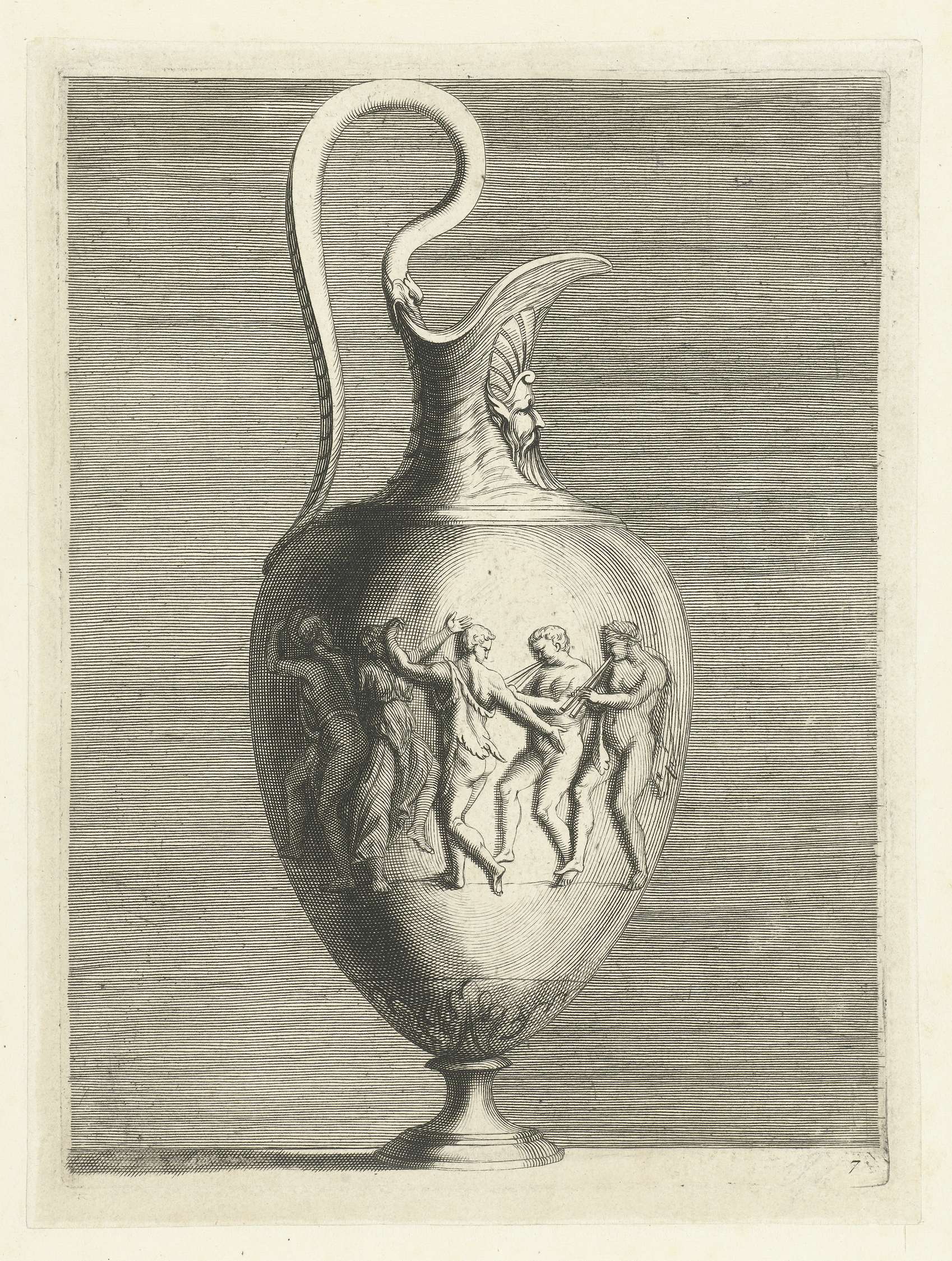 Het handvat loopt uit in een slangenkop, onder de tuit is een masker. Blad 7 uit serie van 24 bladen, genummerd: 1-21, 23-25.