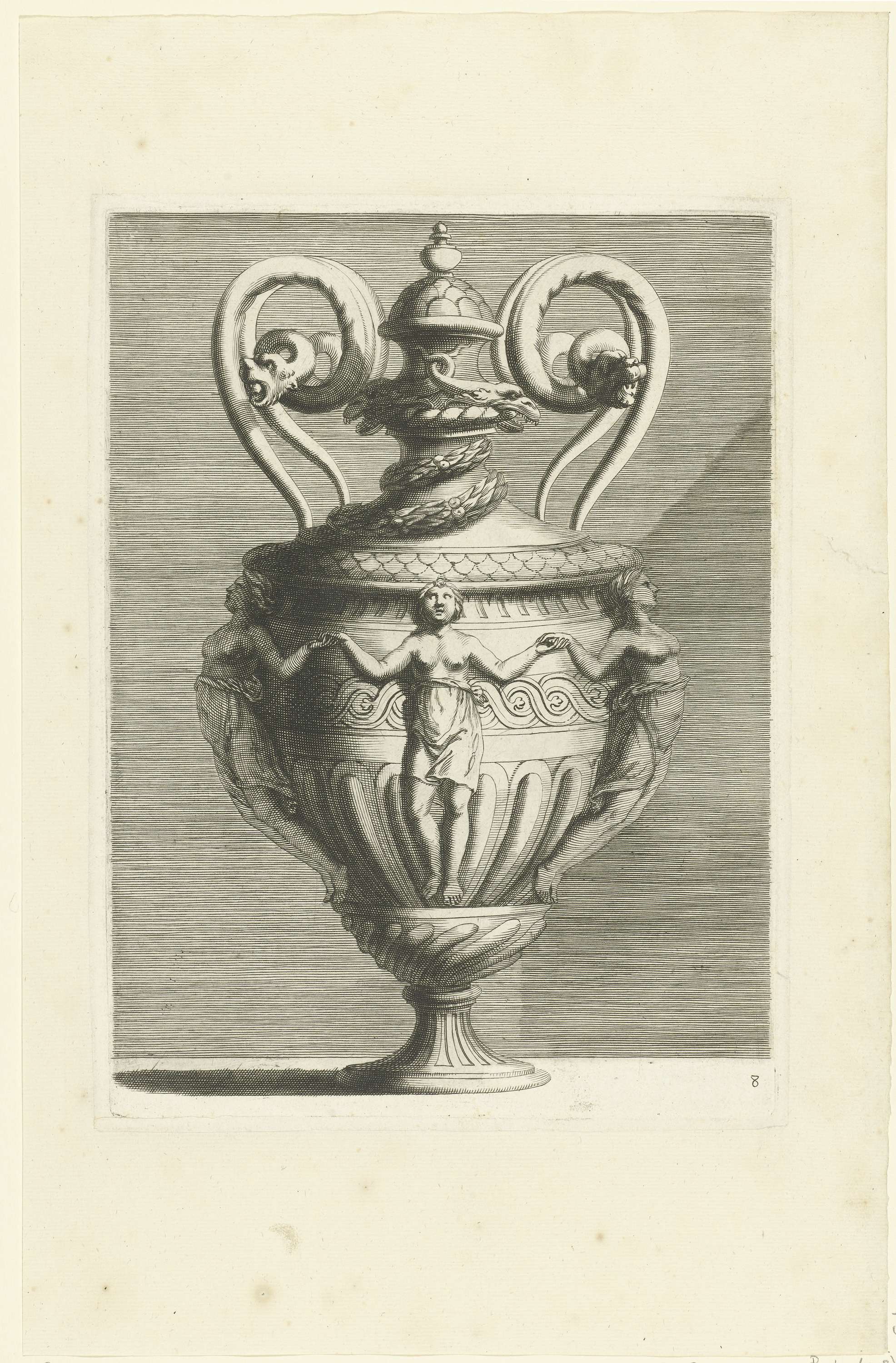 Het lichaam is gedecoreerd met een eierlijst en drie vrouwen, op de deksel bijten twee slangen in een kabel. Blad 8 uit serie van 24 bladen, genummerd: 1-21, 23-25.