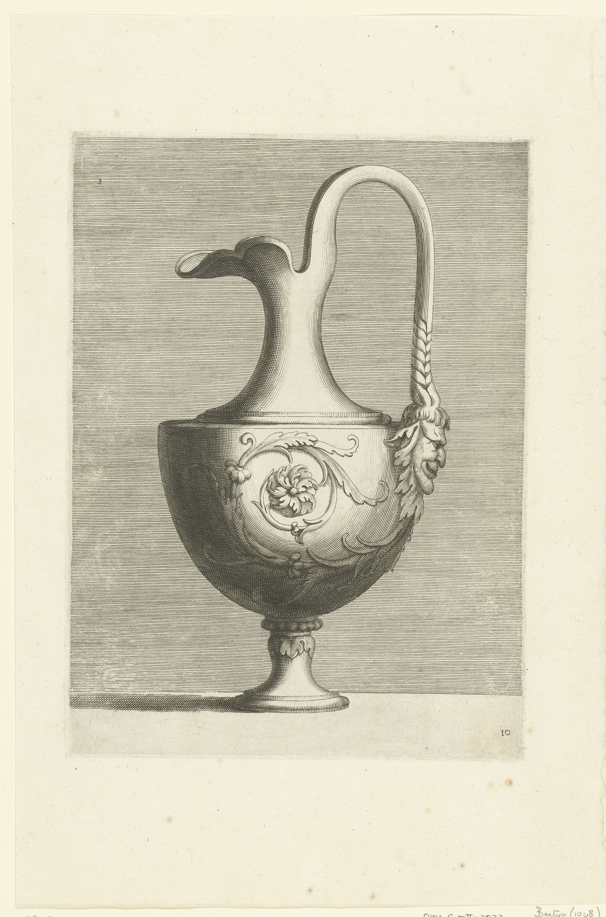 Het lichaam heeft de vorm van een half ei en is gedecoreerd met een bladrank. Blad 10 uit serie van 24 bladen, genummerd: 1-21, 23-25. Deze serie werd opgevolgd door de serie Second Livre de Vases, bestaande uit 25 bladen, waarin de nummering doorloopt.