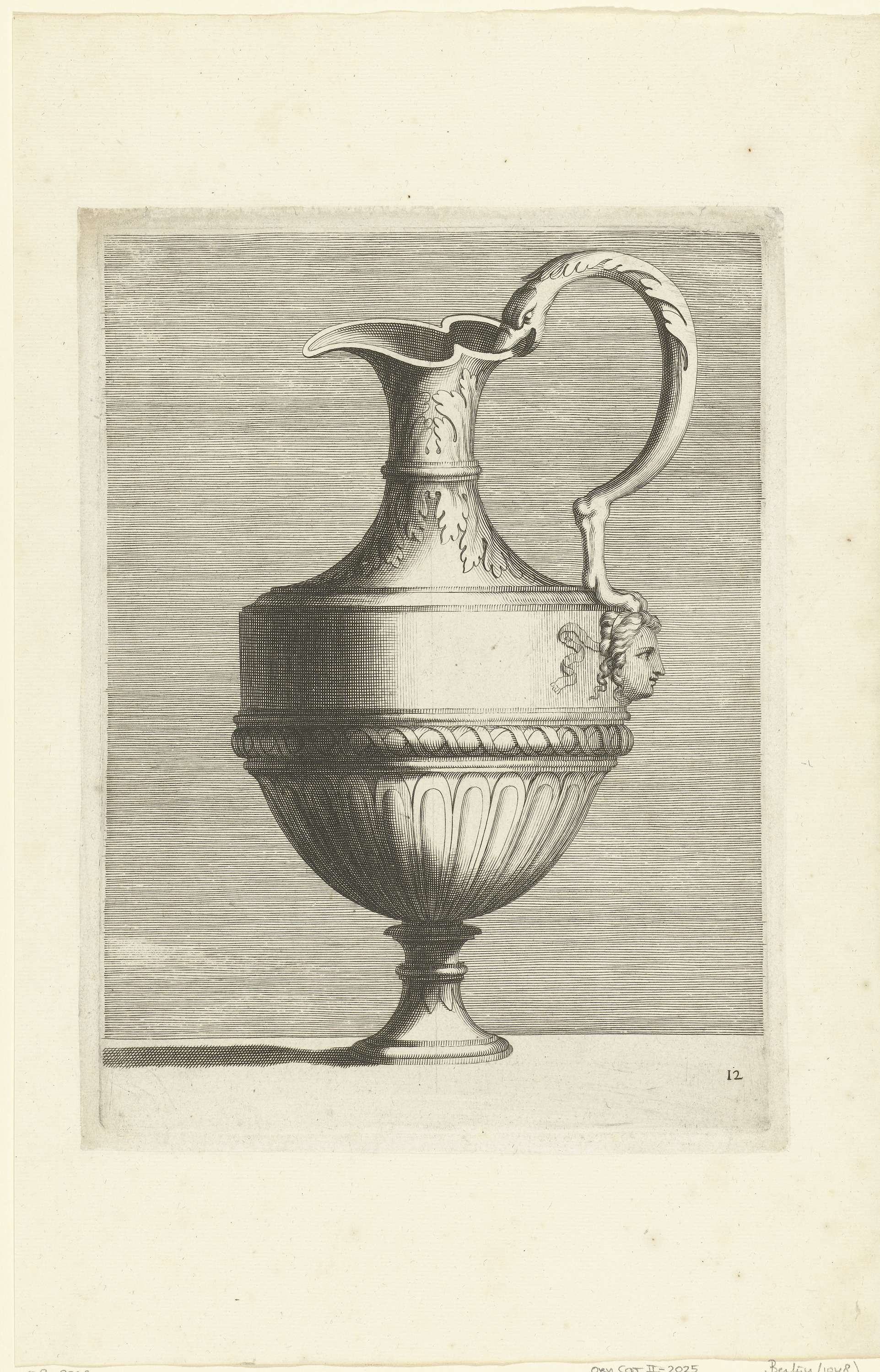 De onderkant is versierd met staafwerk, het handvat rust met een dierenpoot op een masker en loopt bovenaan uit in een slangenkop. Blad 12 uit serie van 24 bladen, genummerd: 1-21, 23-25. Deze serie werd opgevolgd door de serie Second Livre de Vases, bestaande uit 25 bladen, waarin de nummering doorloopt.