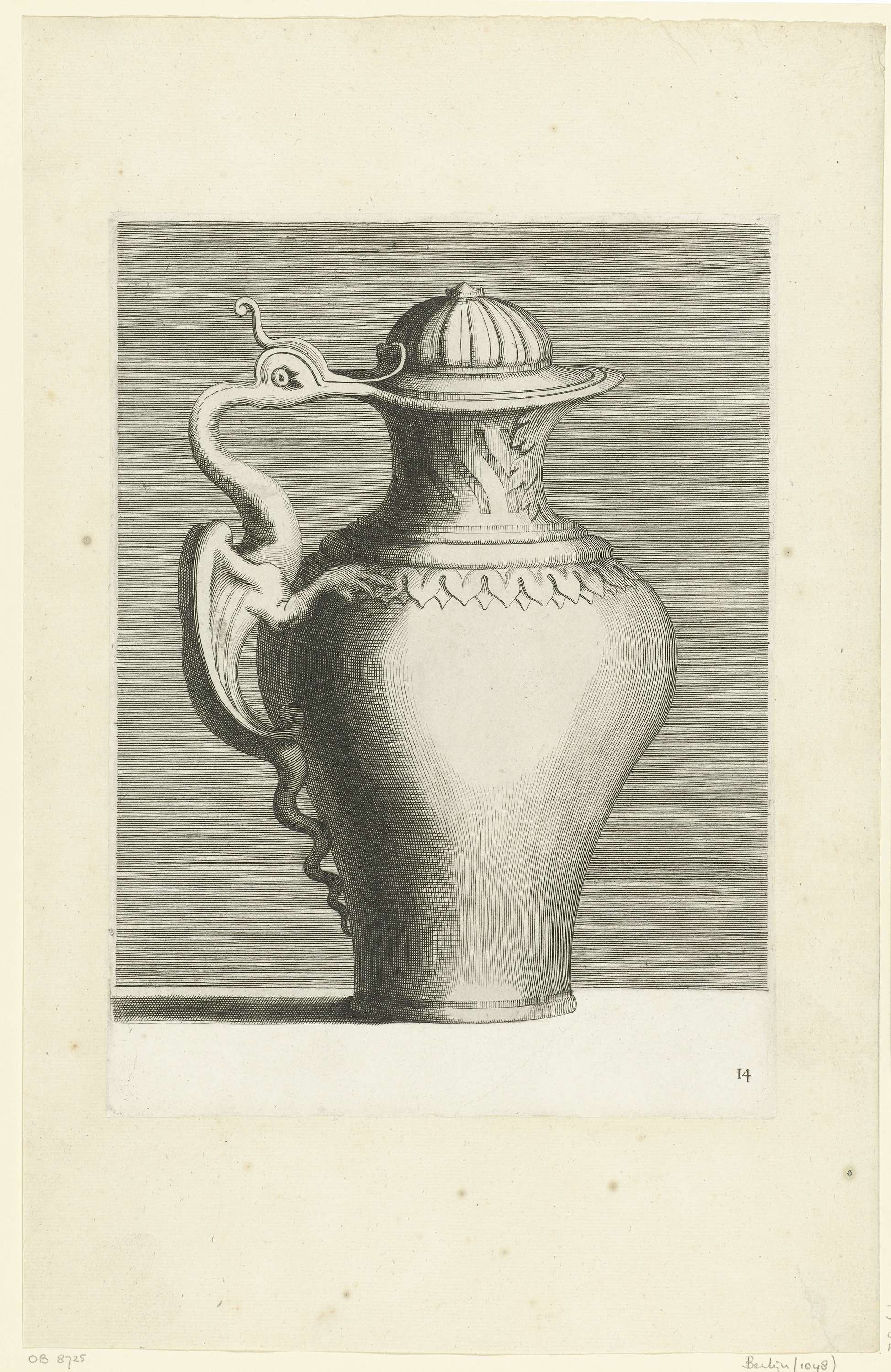 Het lichaam van de vaas is bovenaan bolvormig, het handvat lijkt op een draak. Blad 14 uit serie van 24 bladen, genummerd: 1-21, 23-25.