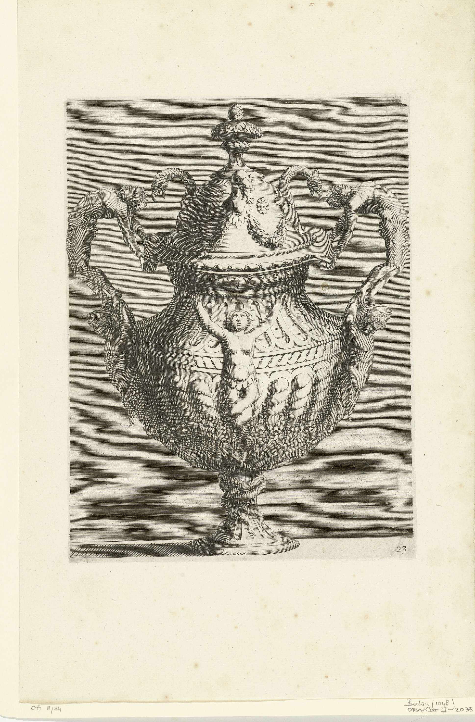 De handvatten hebben de vorm van naakte jongens, staand op de schouders van een man. Blad 23 uit serie van 24 bladen, genummerd: 1-21, 23-25.