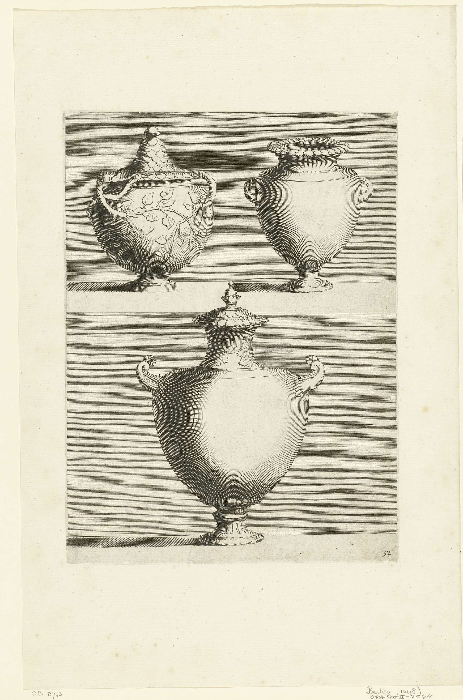 De vaas linksboven heeft een deksel en is gedecoreerd met takken waar bladeren aan zitten; de handvatten worden gevormd door twee takken. Blad 32 uit serie van 25 bladen, genummerd: II (voorheen 26), 27-50. Deze serie werd voorafgegaan door de serie Livre de Vases, bestaande uit 24 bladen waarin de nummering begon.