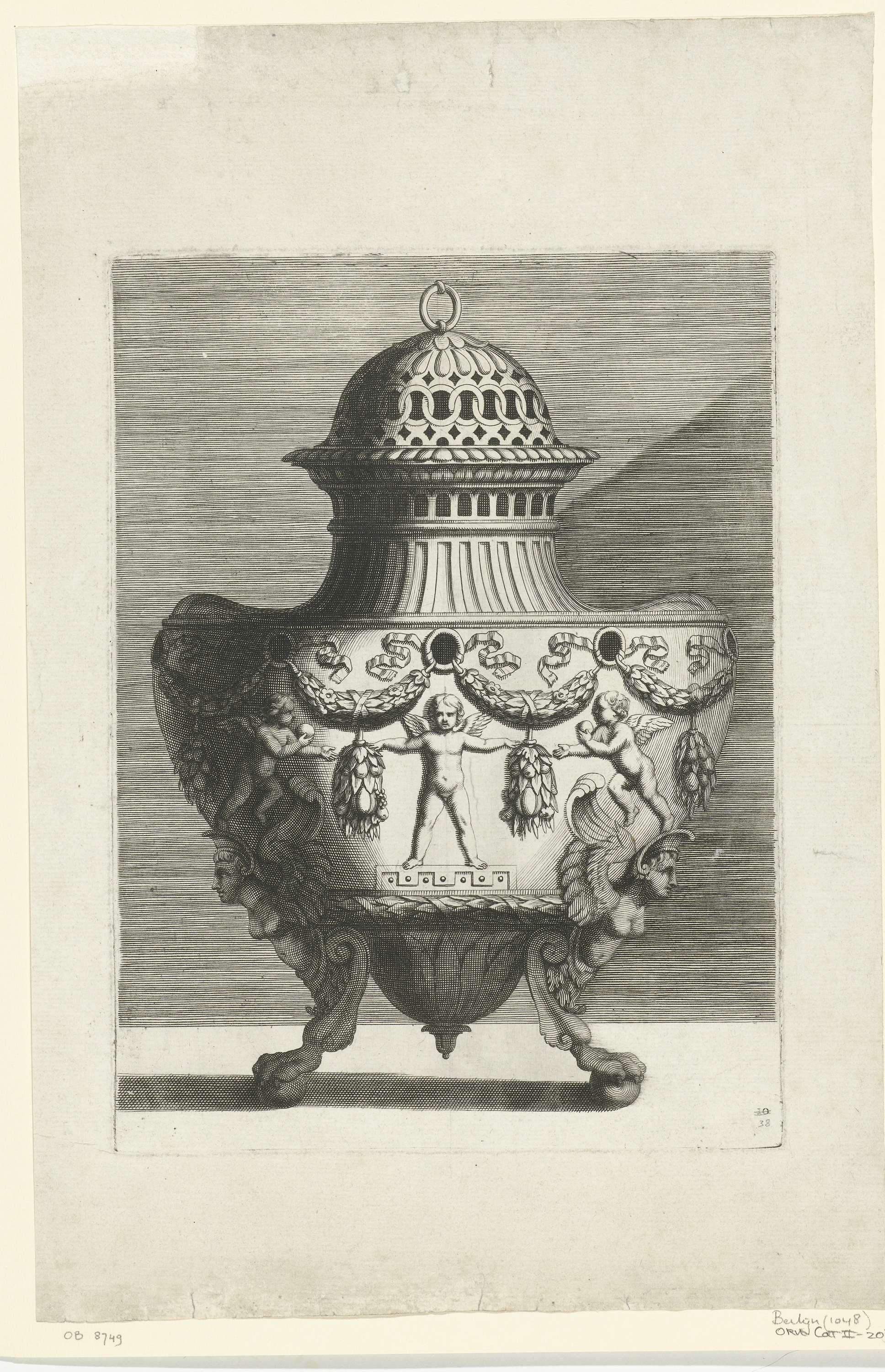 Het lichaam is gedecoreerd met guirlandes, festoenen en putti. Rechtsonder: 10, dit blad behoorde oorspronkelijk tot de eerste serie van de vazen, nummer 10 (?). Blad 38 uit serie van 25 bladen, genummerd: II (voorheen 26), 27-50.
