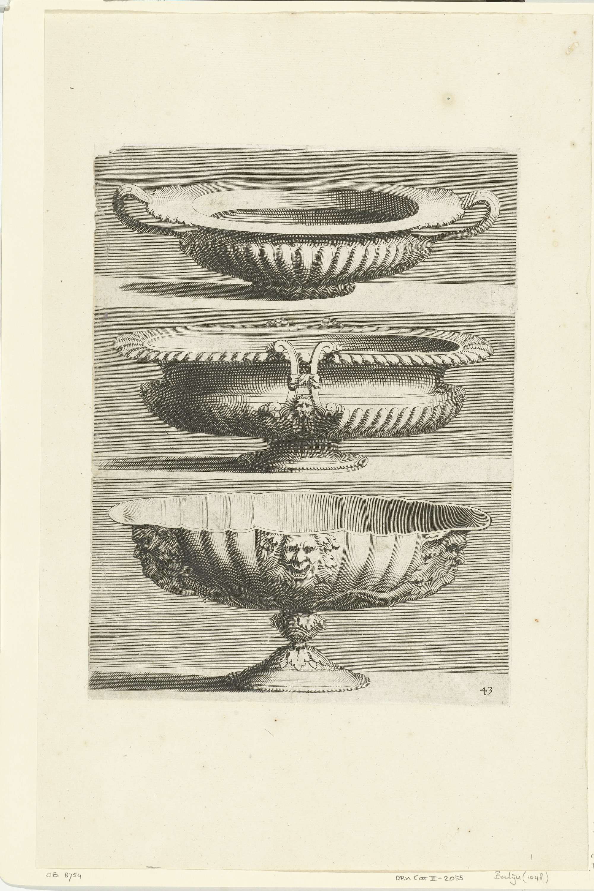 De onderste schaal is gedecoreerd met drie maskers tussen bladeren. Blad 43 uit serie van 25 bladen, genummerd: II (voorheen 26), 27-50.