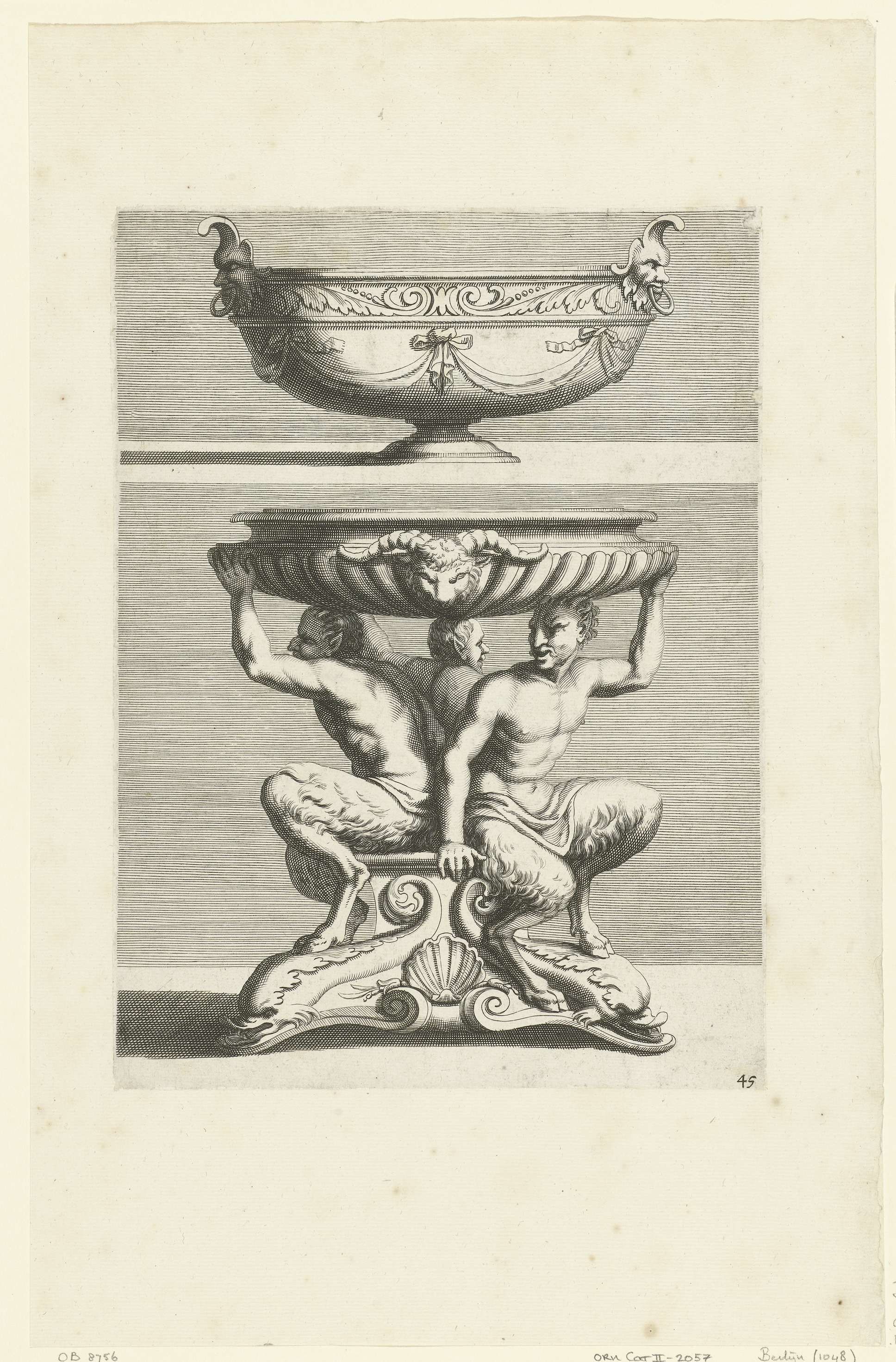 Het bassin onderaan is gedecoreerd met de kop van een ram en wordt gedragen door drie zittende saters. Blad 45 uit serie van 25 bladen, genummerd: II (voorheen 26), 27-50.