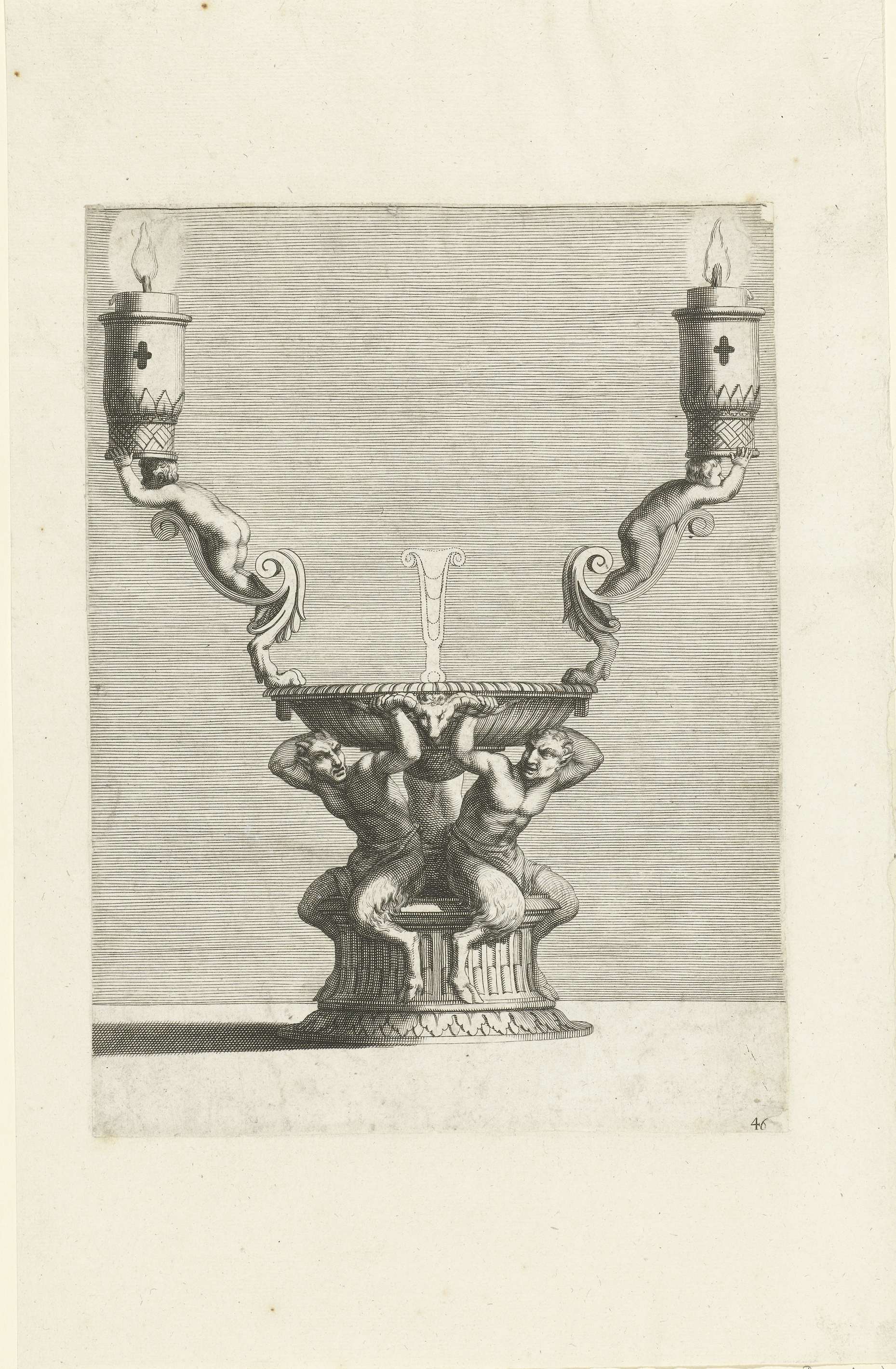 De armen bestaan uit een leeuwenklauw waaruit een console ontspruit met daarop een liggende putti die een brandende kaars vasthoudt. Blad 46 uit serie van 25 bladen, genummerd: II (voorheen 26), 27-50. Deze serie werd voorafgegaan door de serie Livre de Vases, bestaande uit 24 bladen, waarin de nummering begon.